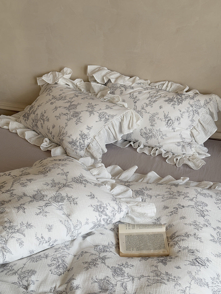 Create a romantic retreat with Magchic's Ophelia Floral Ruffle Double Gauze Bedding Set. Crafted from airy. breathable double gauze. this set offers a soft. lightweight feel perfect for year-round comfort. The delicate floral pattern and cascading ruffles exude elegant charm. bringing a dreamy. vintage-inspired aesthetic to your space. Each duvet cover features corner ties and a hidden zipper closure. securing duvet inserts for a flawless look and lasting quality tailored just for you. Designed for those who adore romantic. feminine decor. this bedding set transforms any bedroom into a cozy. sophisticated sanctuary.