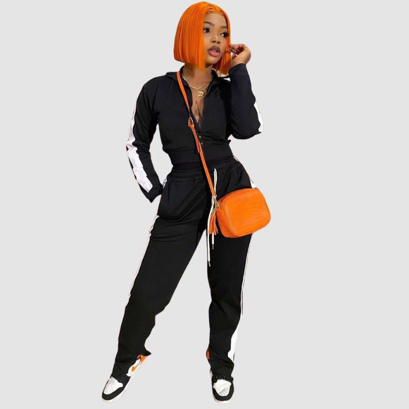 Características: Conjunto. pantalón. solapa. chaqueta. cremallera. manga larga. pantalón largo. ajustado. cremallera. abertura. contraste de color. cintura alta.