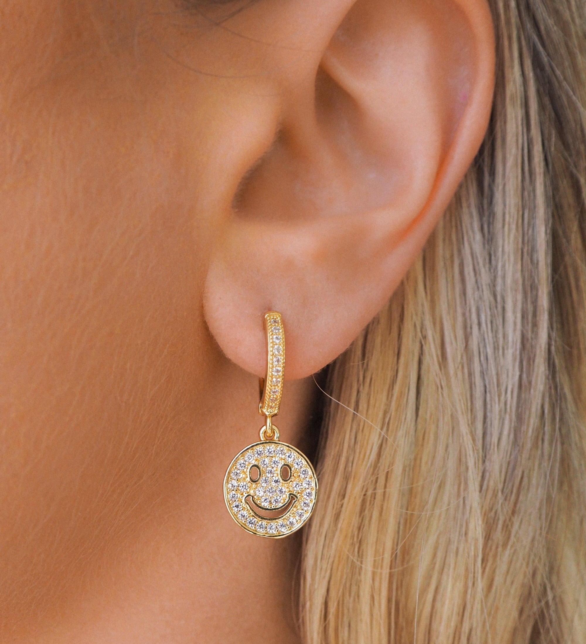 Pendientes de aro con cara sonriente y cristales pavé bañados en oro