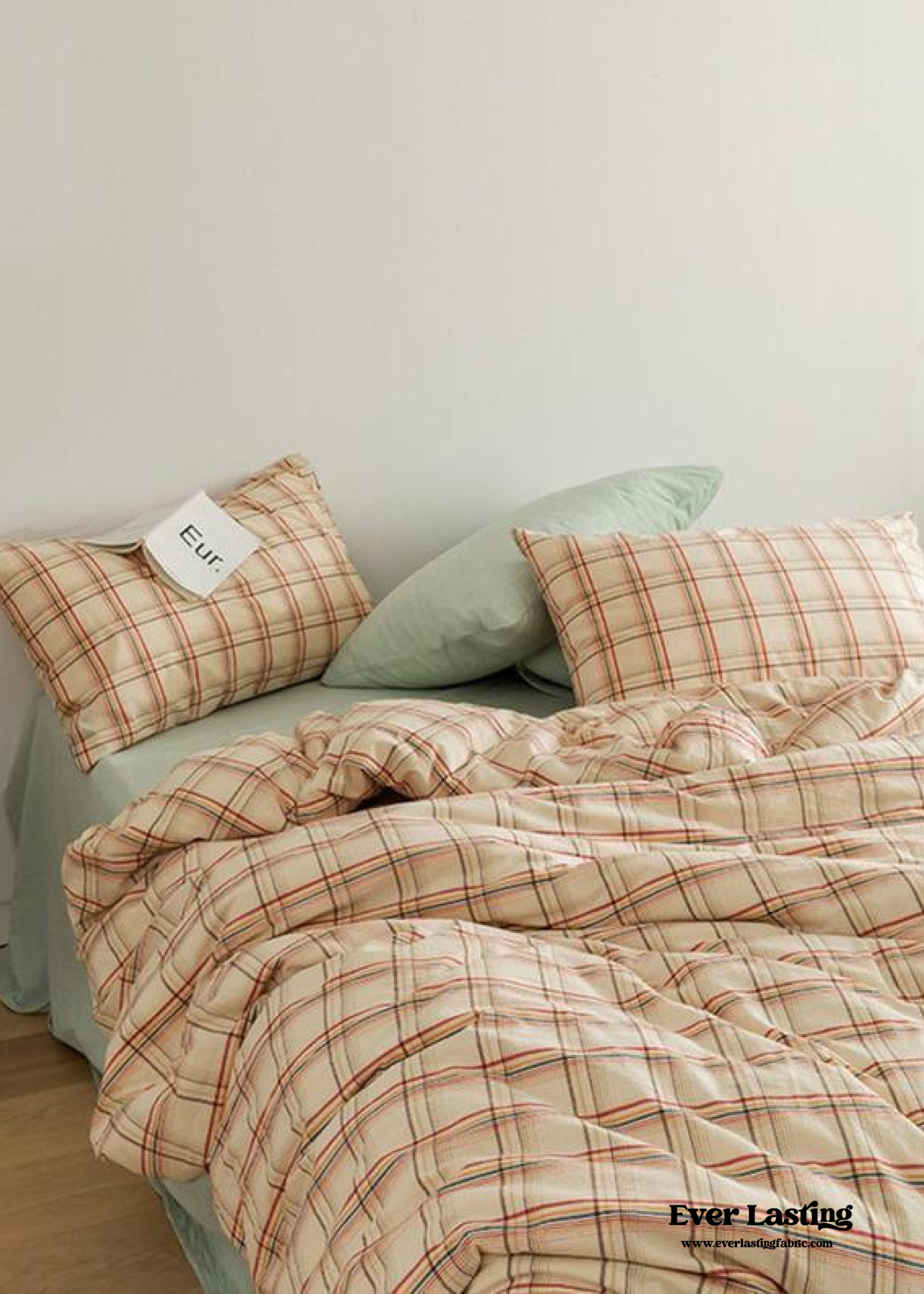 Effortlessly beautiful bedding. Our plaid bedding set is the perfect combination of colors and pattern. This styled set comes with a plaid duvet cover. pillowcases and a solid color bed sheet. Made with 100% cotton material. enjoy the set as it gets softer with every use!