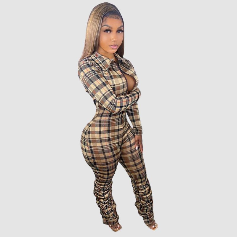 Características: Mono. Pantalones. Ajustado. Cintura alta. Solapa. Cremalleras. Contraste de color. Plisado. Diseño estampado a cuadros. Mangas largas.