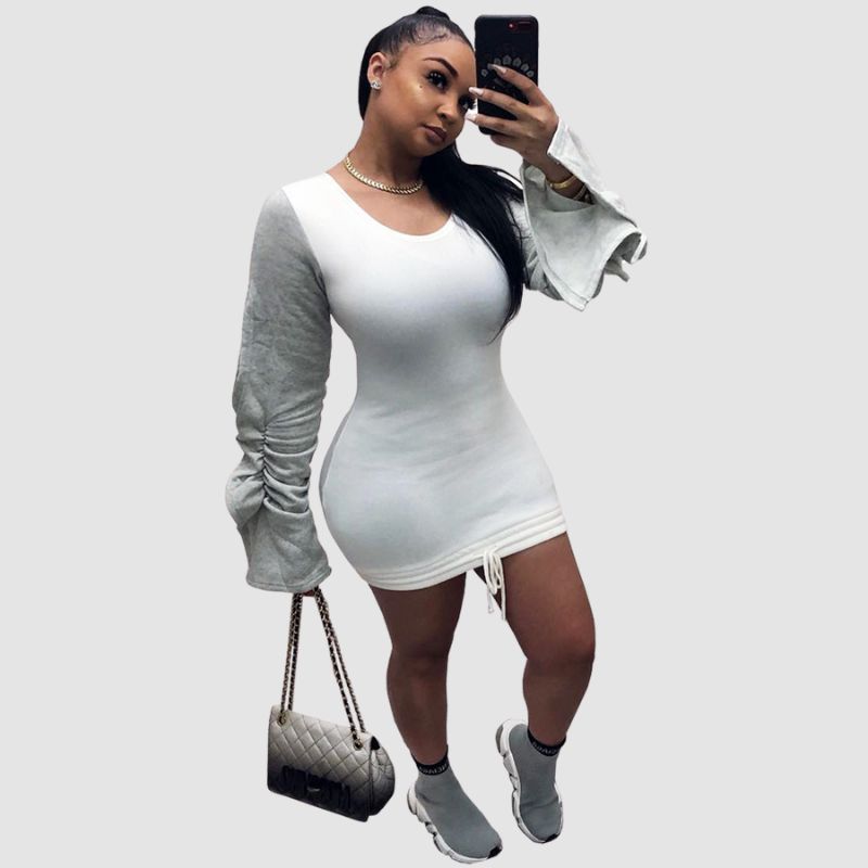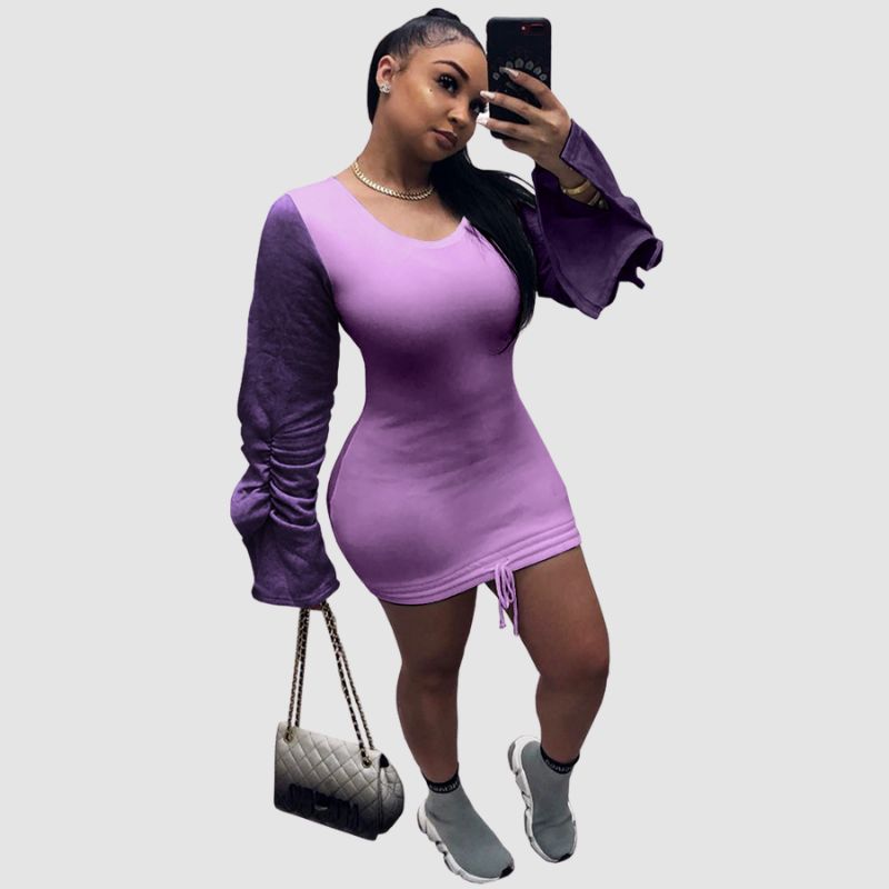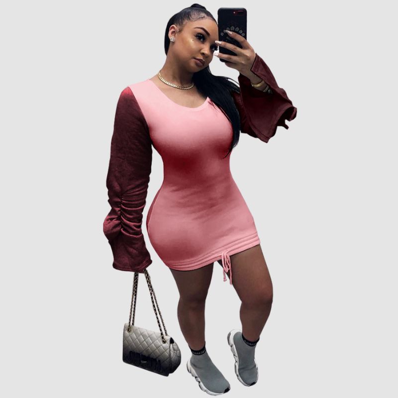 Características: Vestido. Manga larga. Cuello redondo. Contraste de color. Plisado. Cordón. Atado. Diseño de patchwork. Mini vestido.