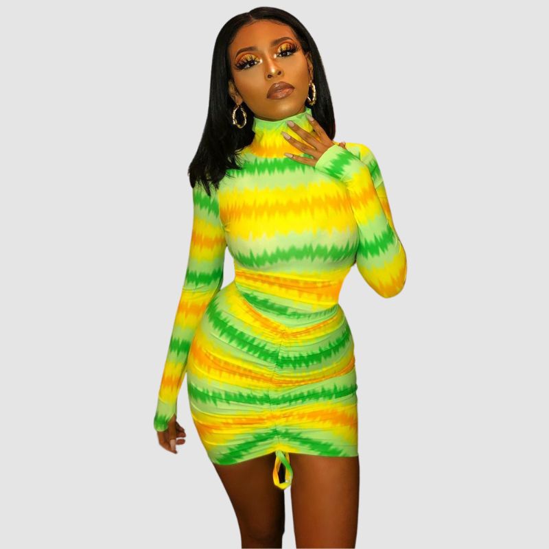 Características: Vestido. Cuello redondo. Cuello alto. Estampado digital. Mangas largas. Diseño con cordón. Contraste de color. Ajustado. Mini vestido.