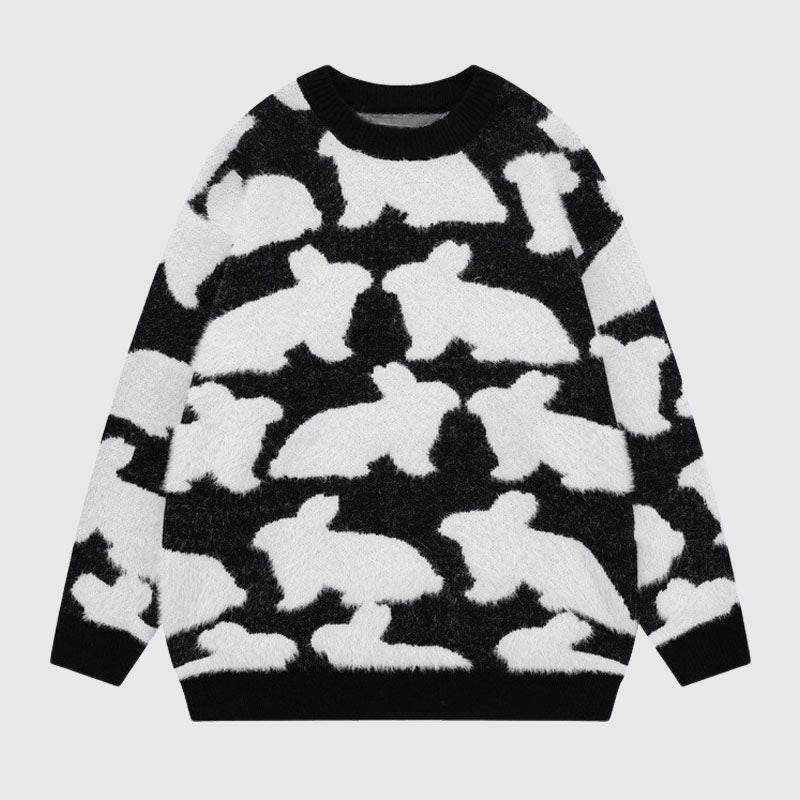 Características: Jersey. Cuello redondo. Manga larga. Diseño estampado con estampado de conejo. Corte relajado. Tejido jacquard. Conjuntos para pareja.