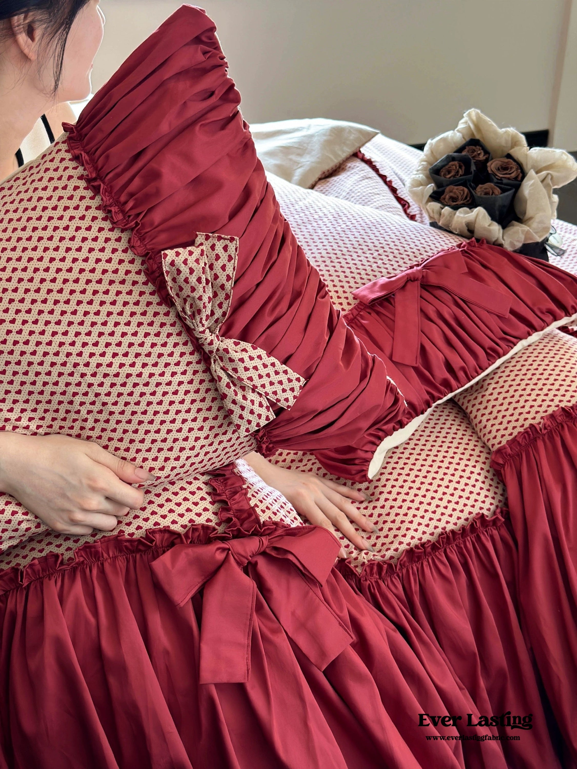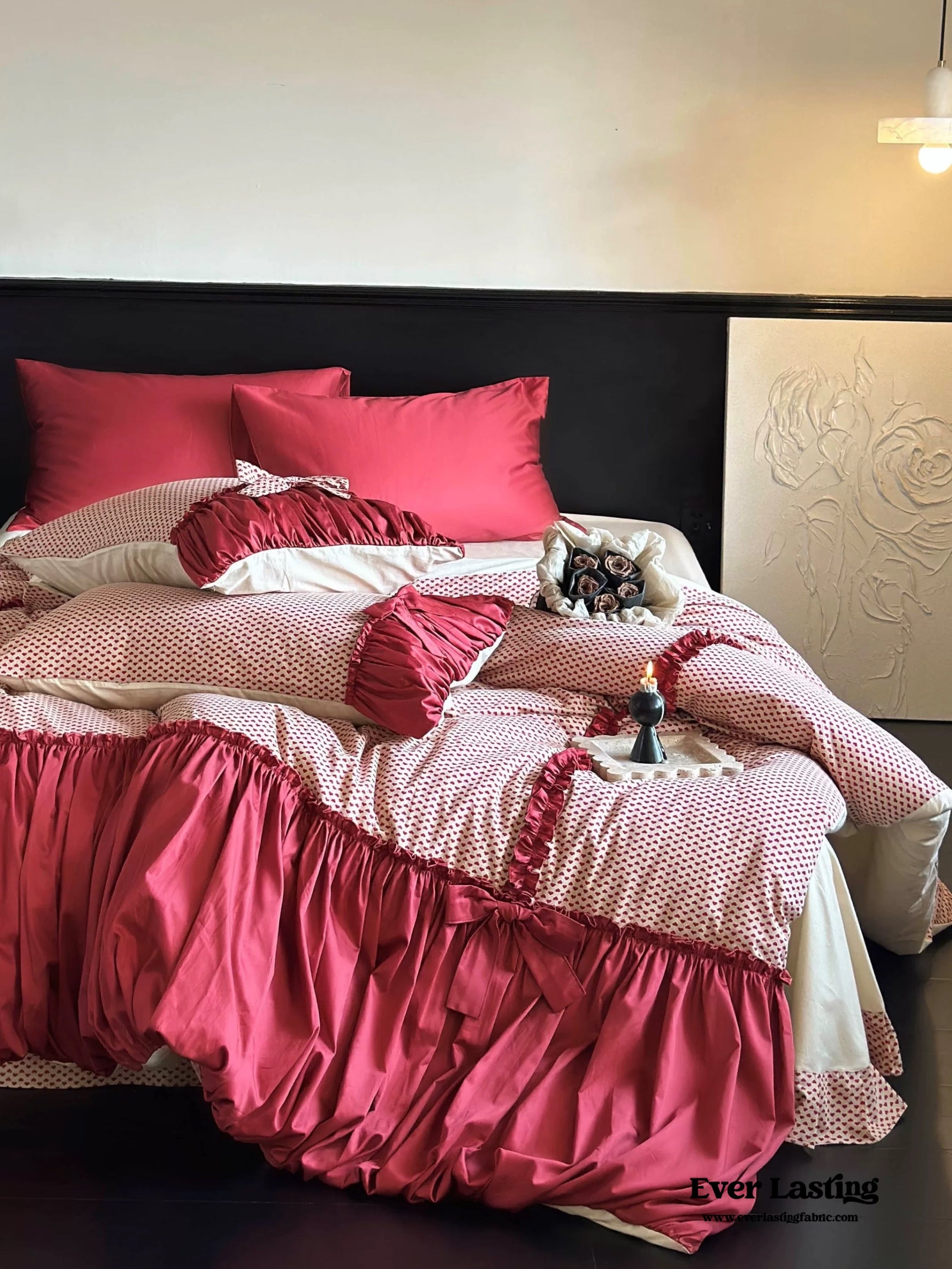 Delight your senses with our Raspberry Cheesecake Ribbon Ruffle Bedding Set. a delicious blend of sweet sophistication and charming design. This set features luscious raspberry hues and delicate ribbon ties that add an exquisite touch to your bedroom. Crafted for both aesthetics and comfort. it turns your space into a haven of modern elegance and relaxation. Each duvet cover features four corner ties and a hidden zipper. ensuring your duvet insert stays securely in place all night. Elevate your sleep experience with this exquisite and stylish bedding set. where the allure of raspberry hues meets the promise of serene sophistication in every ruffle and ribbon.