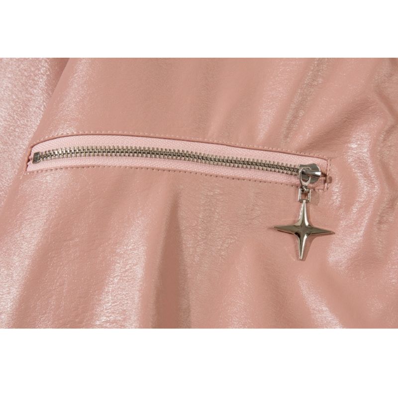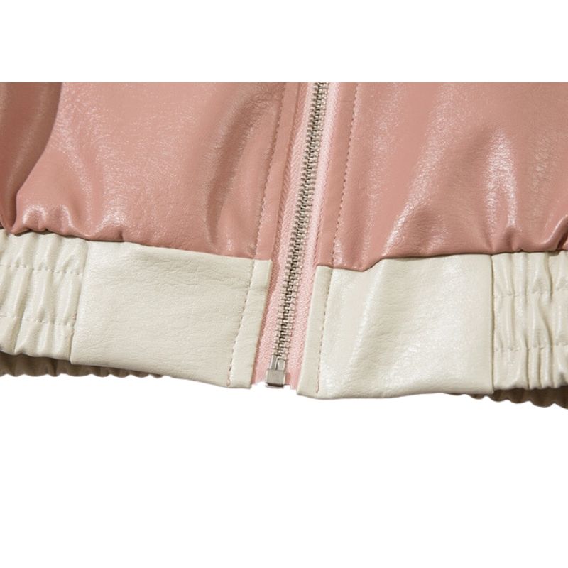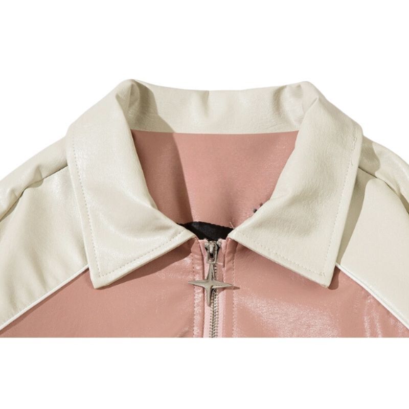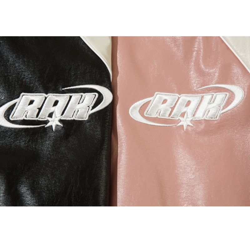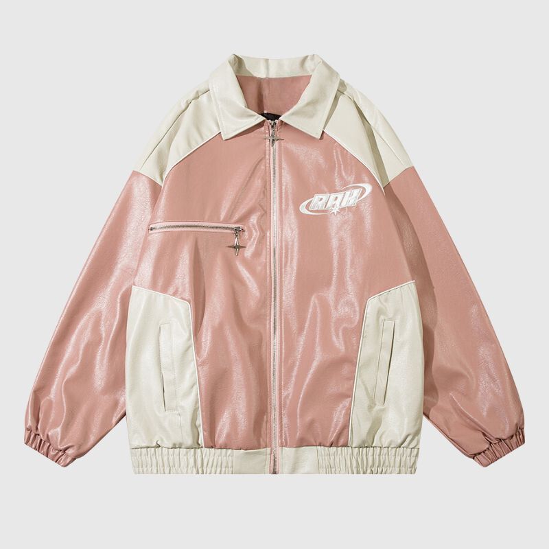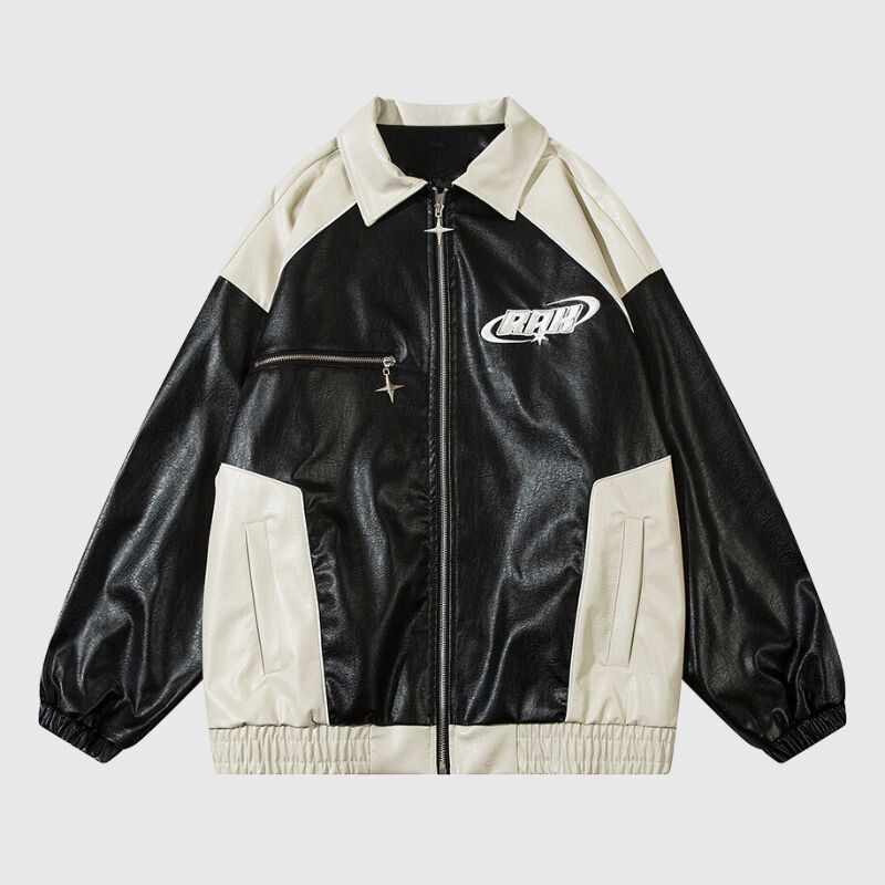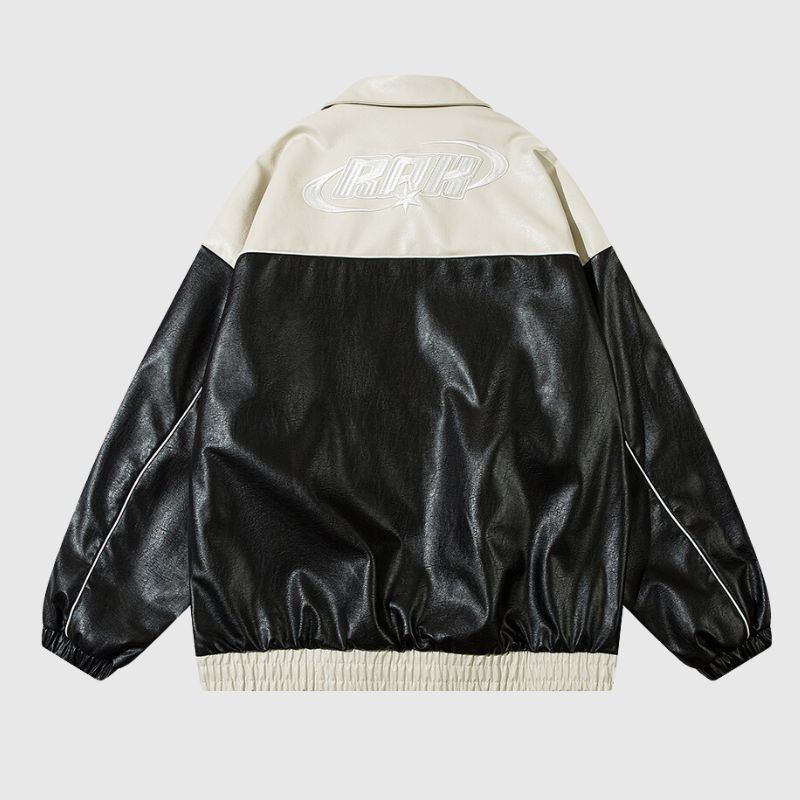 Chaqueta de cuero con bordado de letras y patchwork retro