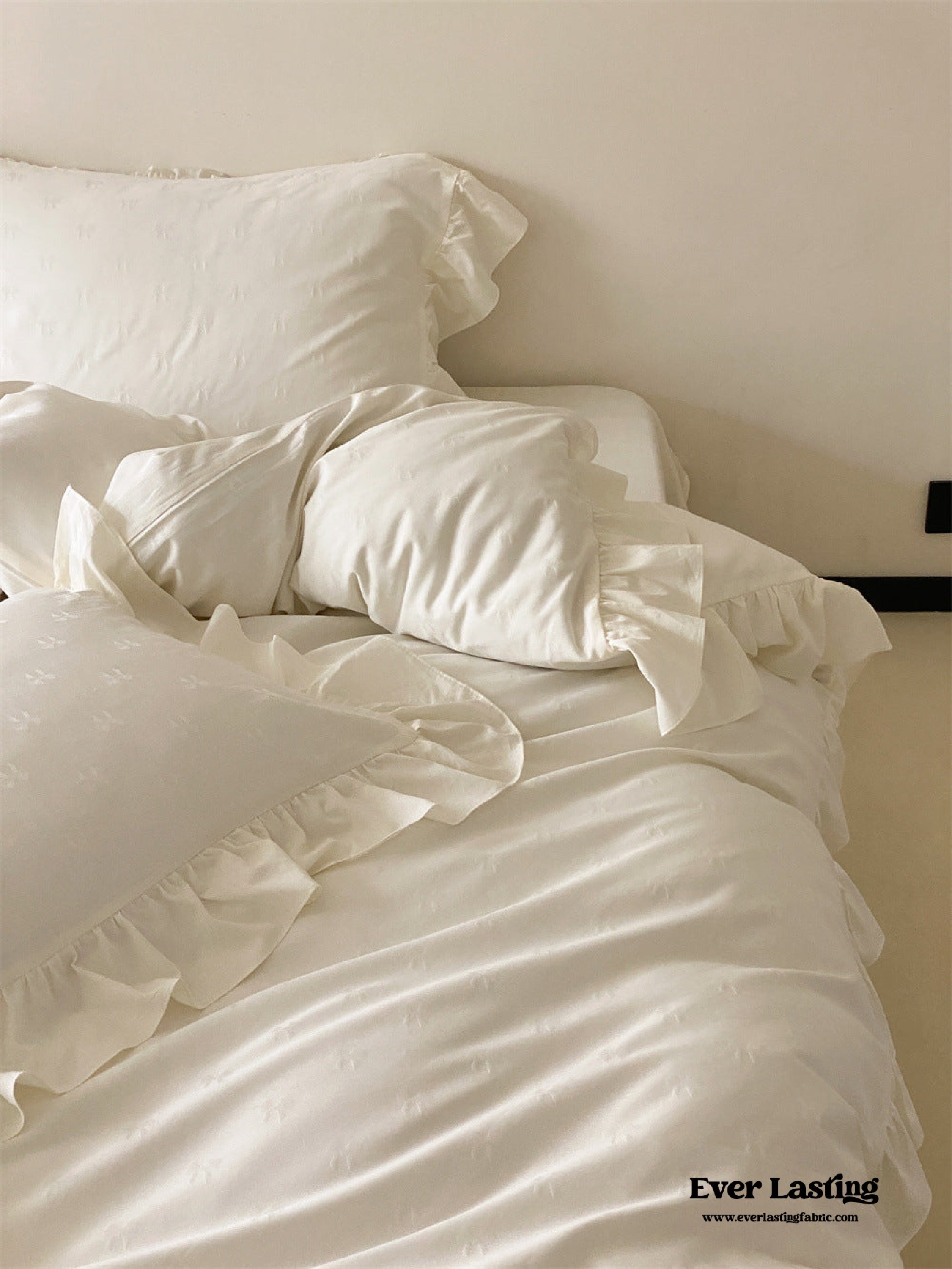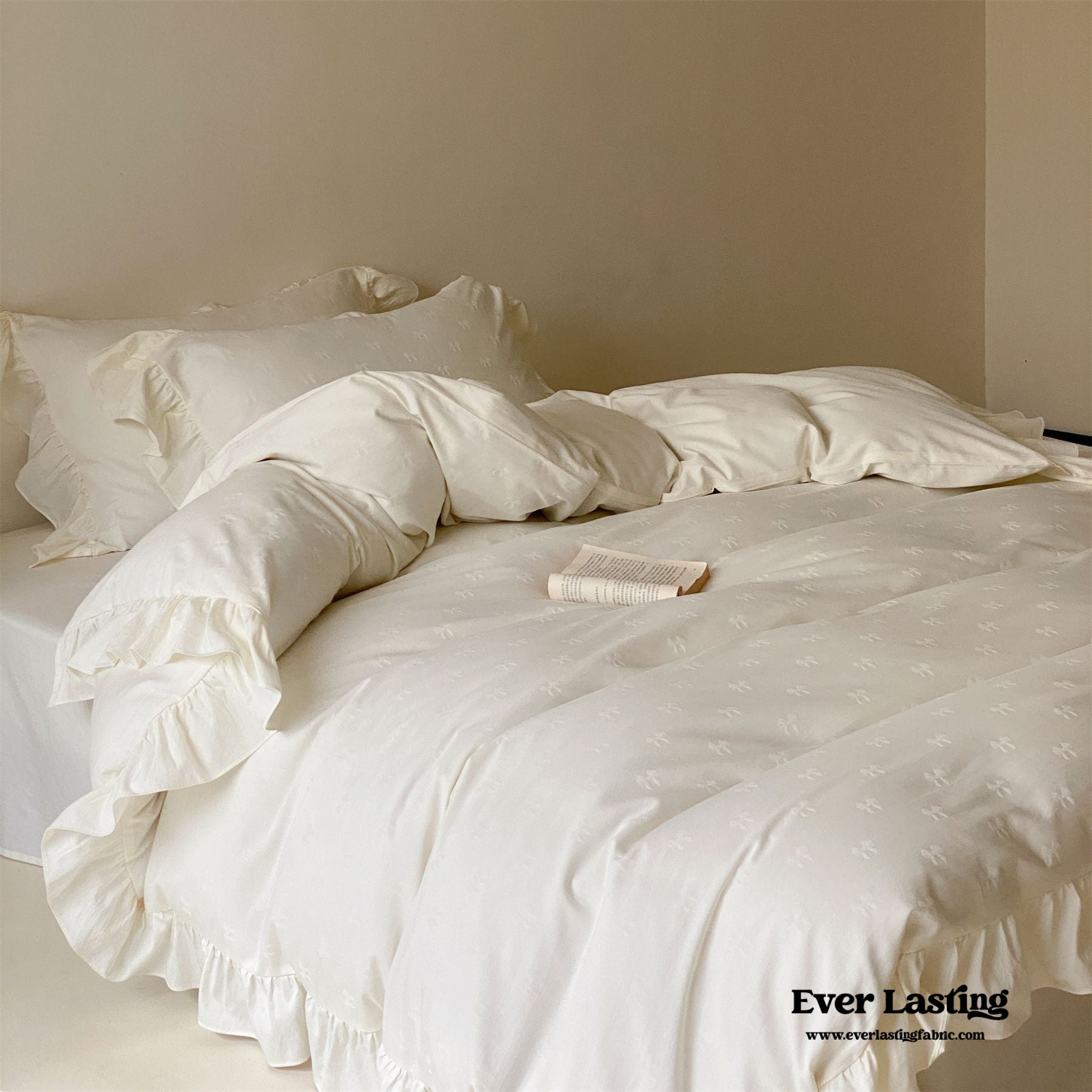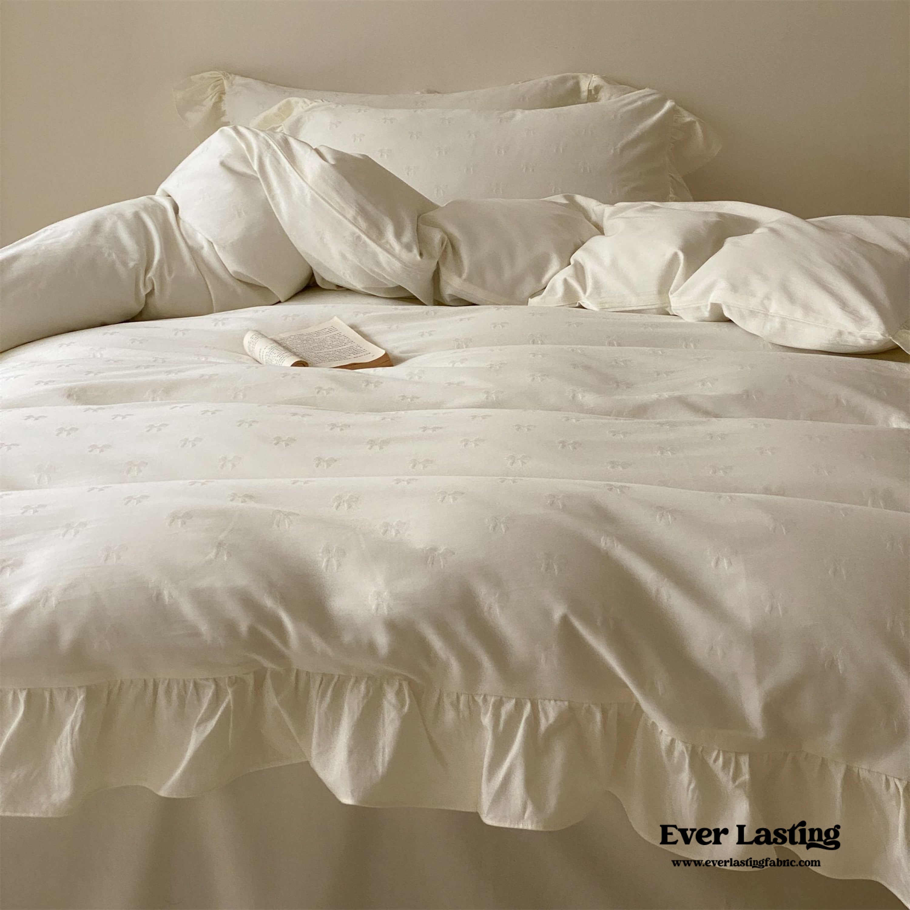 Experience the ultimate in luxury and feminine charm with Magchic's Ribbon Ruffle White Bedding Set. Crafted from the finest washed cotton. this bedding ensemble envelops you in a soft. velvety embrace. offering a delicate touch that feels like a coquette feminine dream. The perfect blend of soft whites and romantic pressed ribbon textures is enhanced with intricate ruffle details and elegant ruffle trim. creating a sophisticated yet playful look that elevates your bedroom decor. Designed with both style and practicality in mind. the duvet cover features four corner ties and a hidden zipper. ensuring your duvet stays perfectly in place throughout the night. Indulge in the beauty and comfort of our Ribbon Ruffle White Bedding Set and transform your space into a cozy. elegant haven that exudes charm and grace.