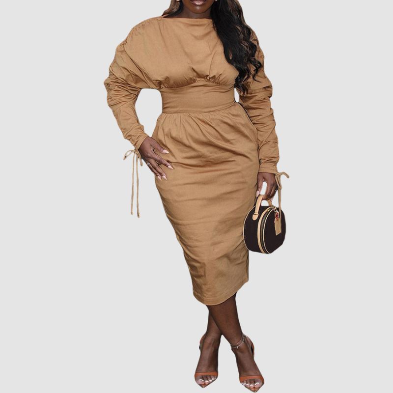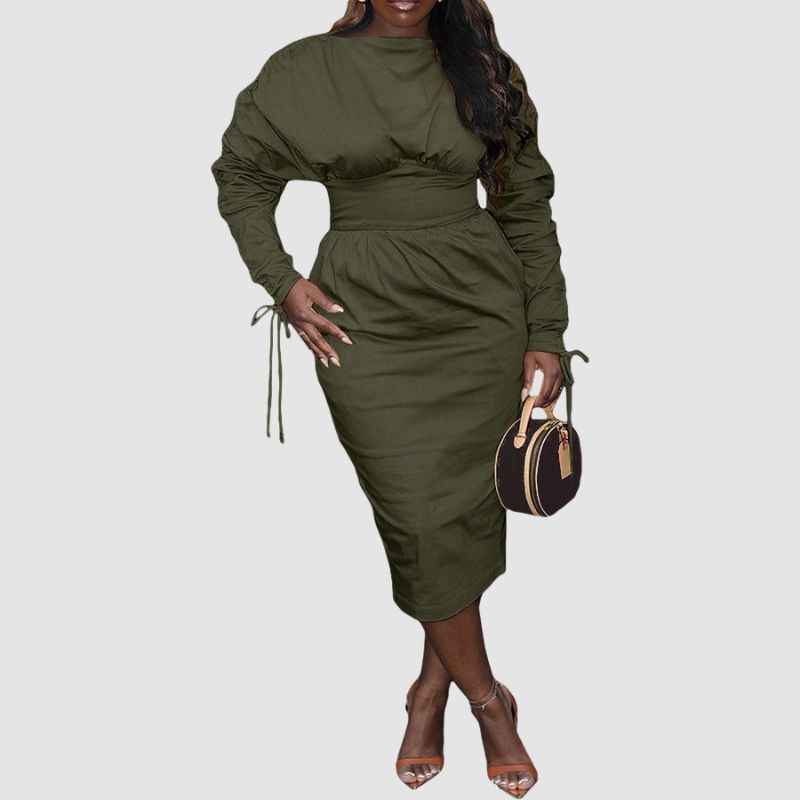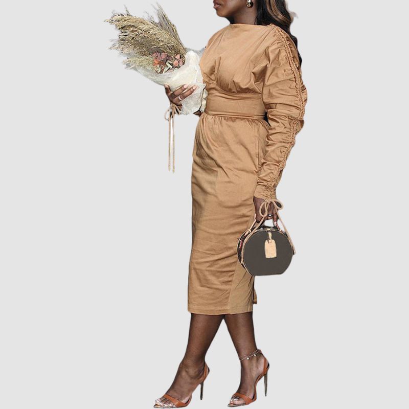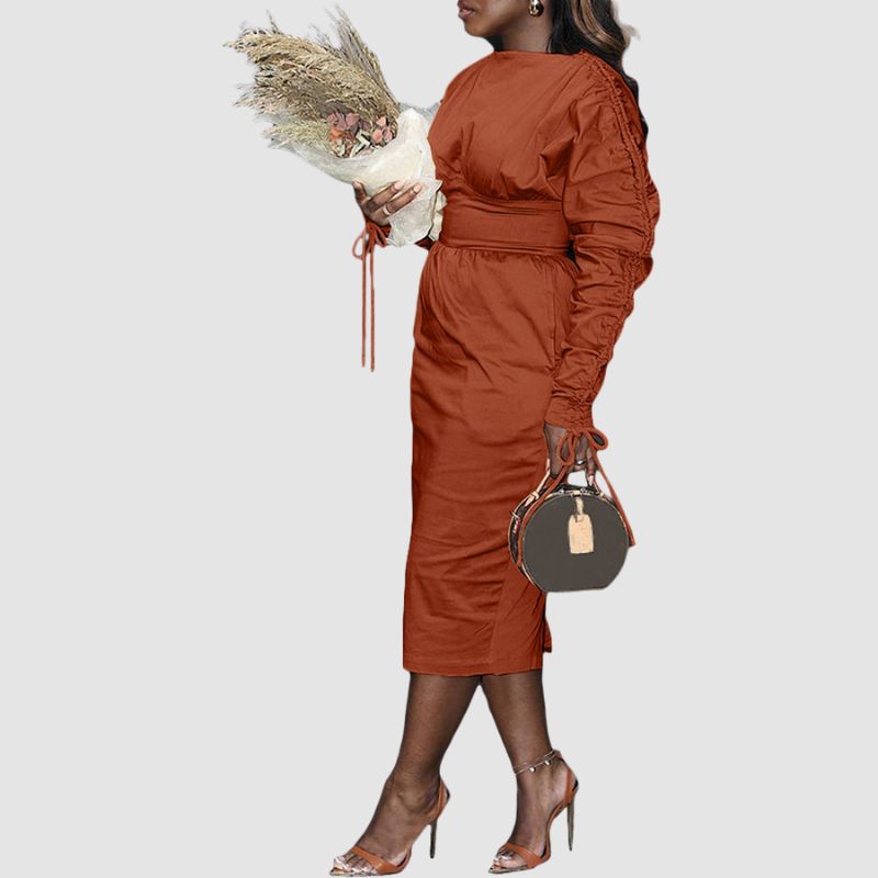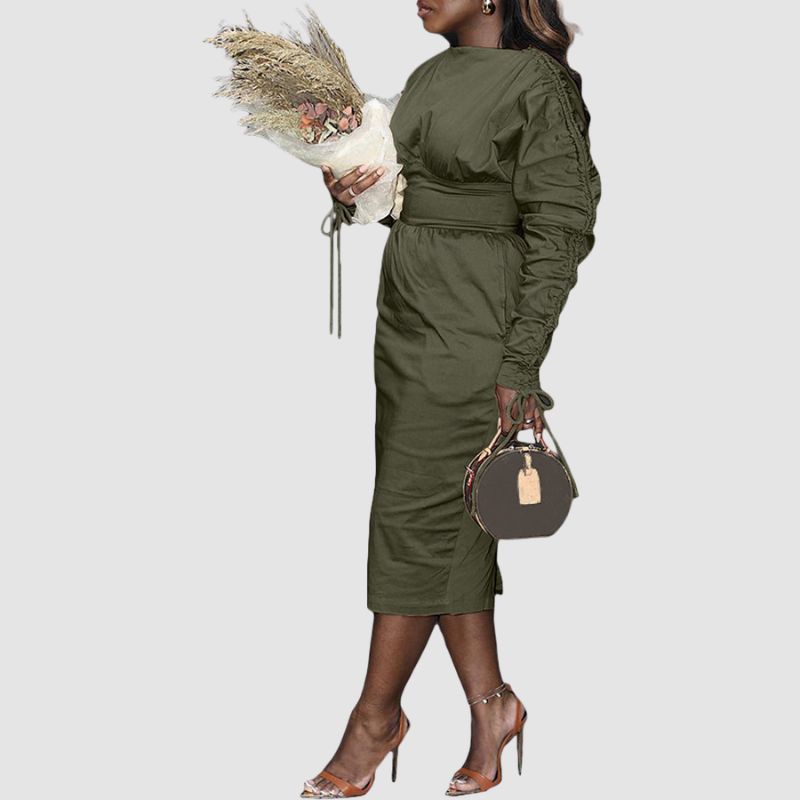 Características: Vestido. Cuello redondo. Mangas largas. Color sólido. Fruncido. Mangas con cordón. Suelto. Cintura alta. Vestido midi.