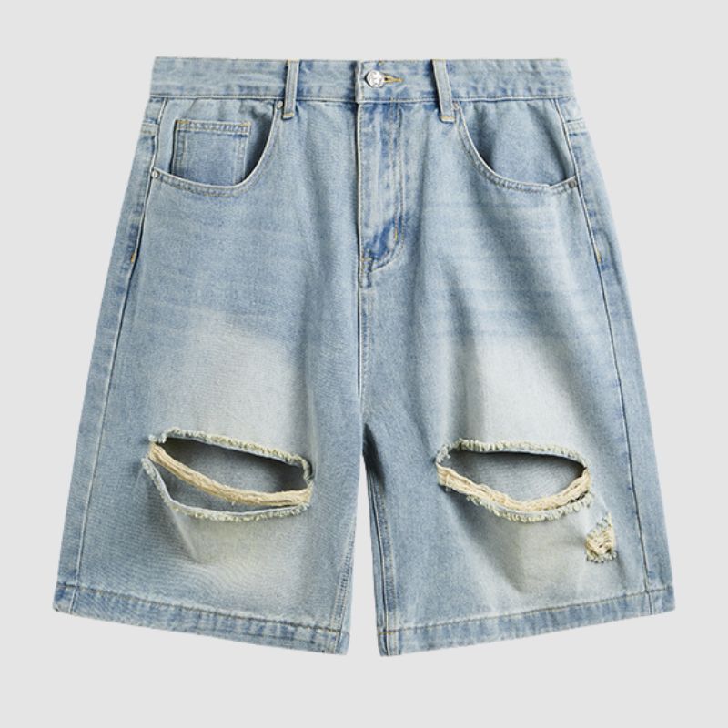 Características: Pantalones cortos. Denim rasgado y rayado. Cintura con cordón. Color sólido. Pierna recta . Ajuste relajado . Unisex. Conjuntos de pareja.
