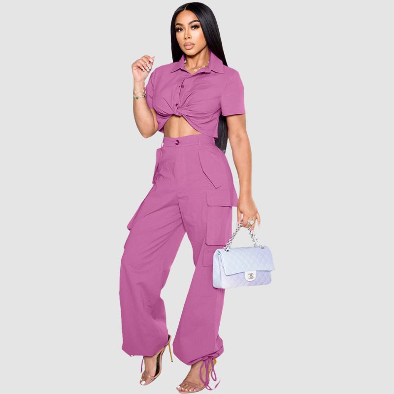 Características: Conjunto. Pantalones. Cuello en V. Top corto. Solapa. Camisa. Manga corta. Pantalones largos. Pantalones cargo. Cordón. Parche de bolsillo. Cintura alta. Pierna ancha. Color sólido.