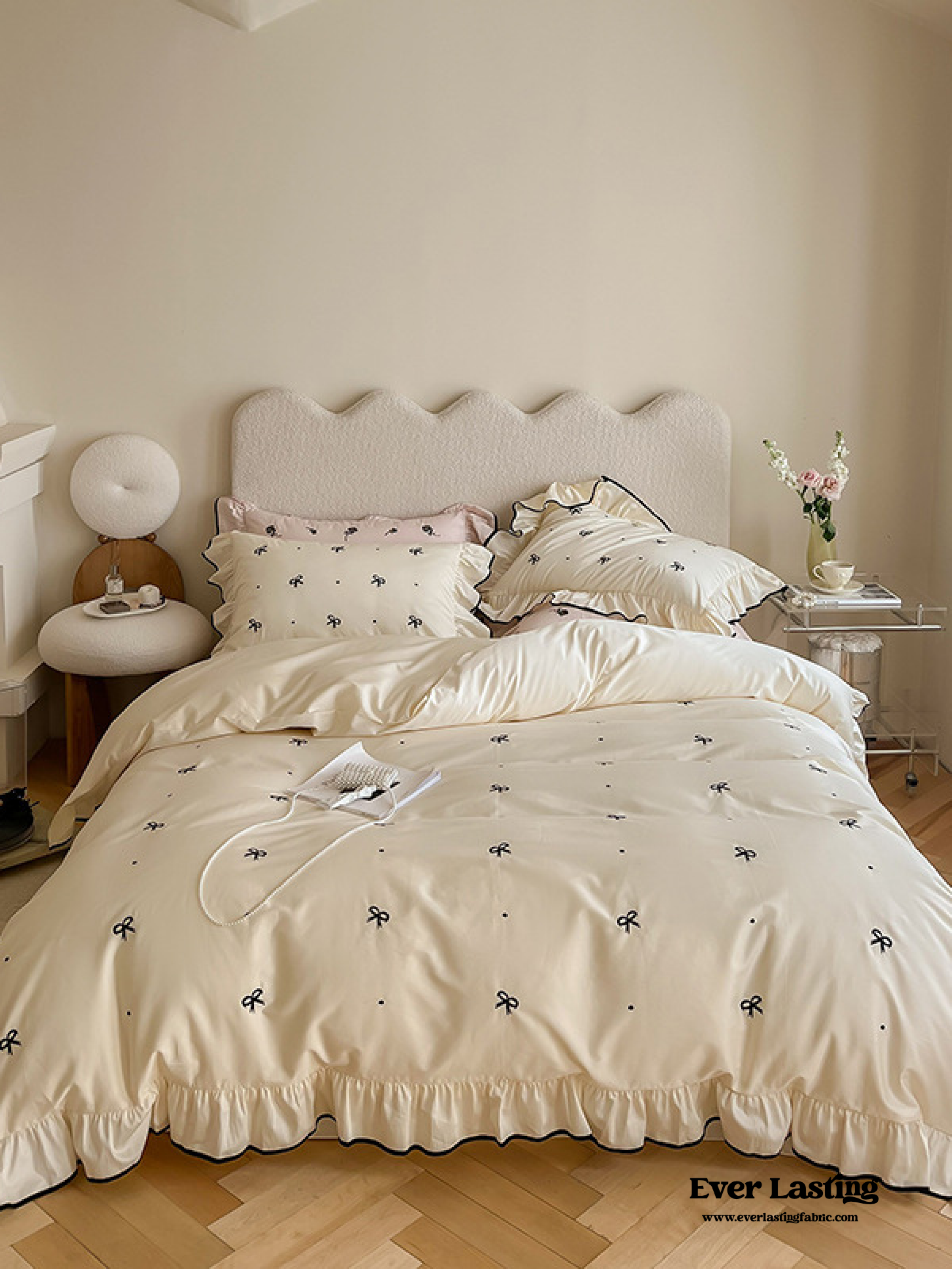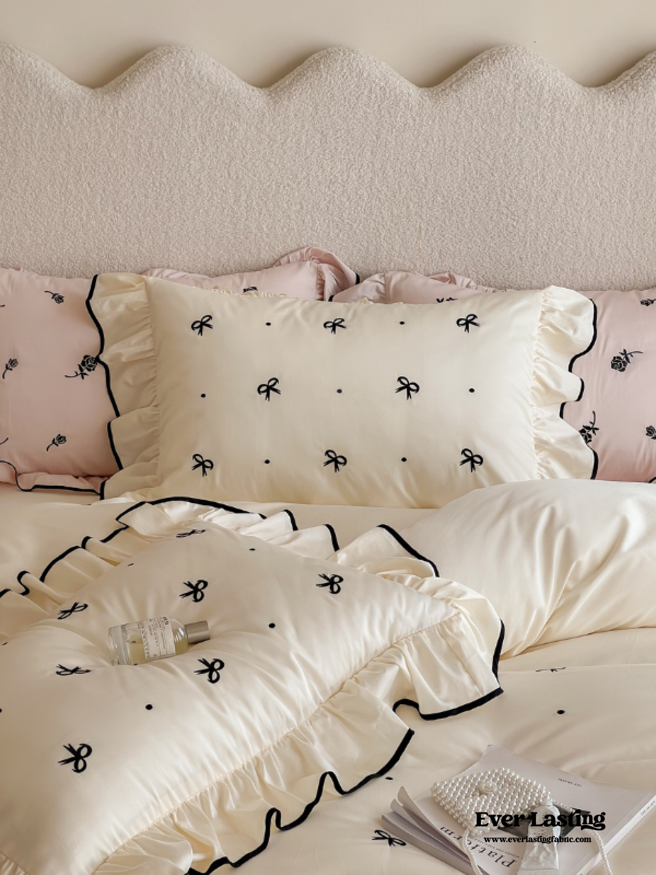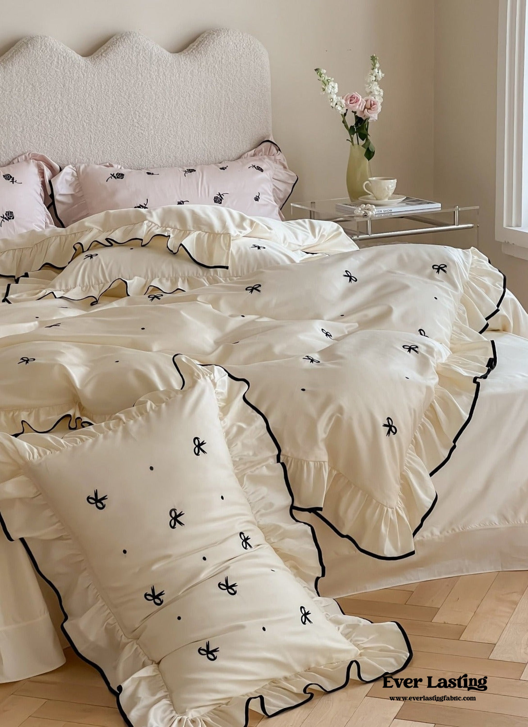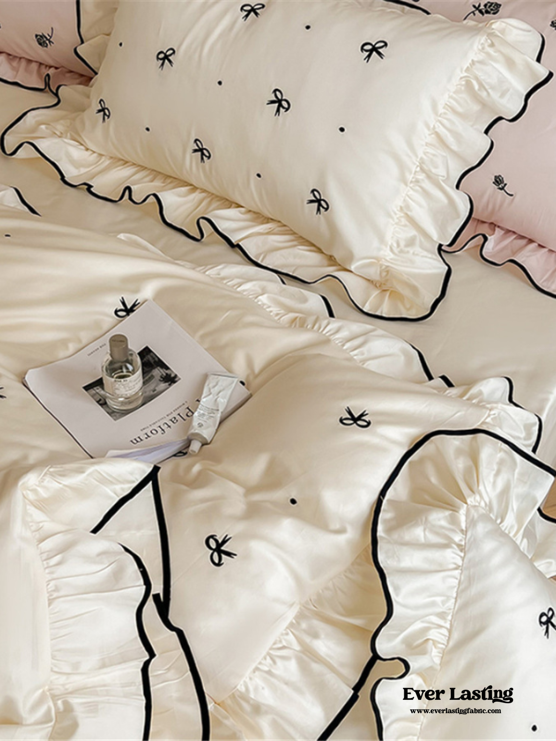 The Silky Ribbon Ruffle Bedding Set is now offered in a bundle. and all bundle sets come with a pre-included 10% to 20% discount! Enjoy savings on a complete set. including a duvet insert and pillow(s). along with our classic duvet cover. bed sheet. and pillowcase(s).