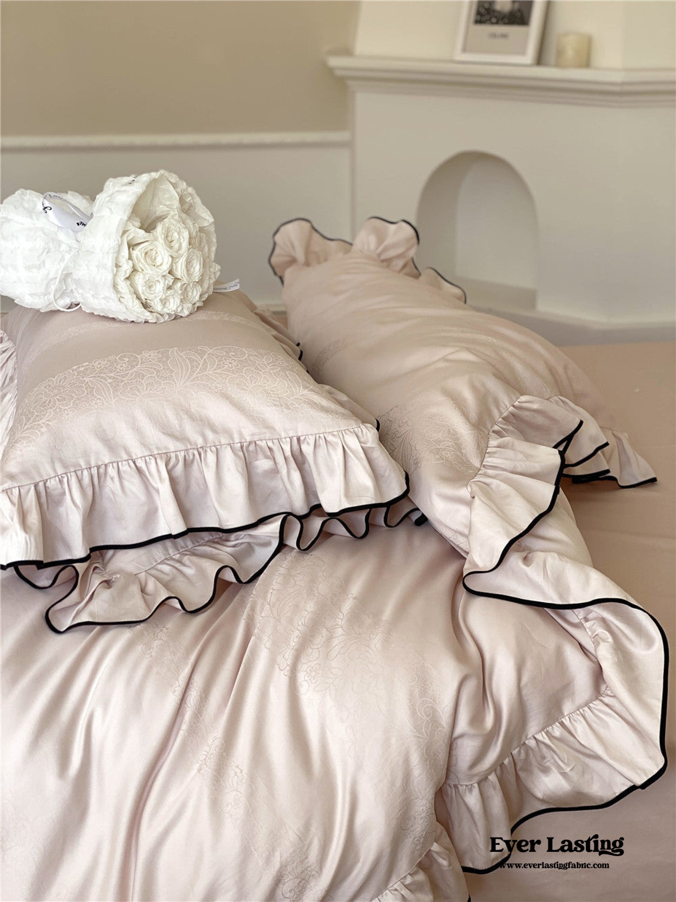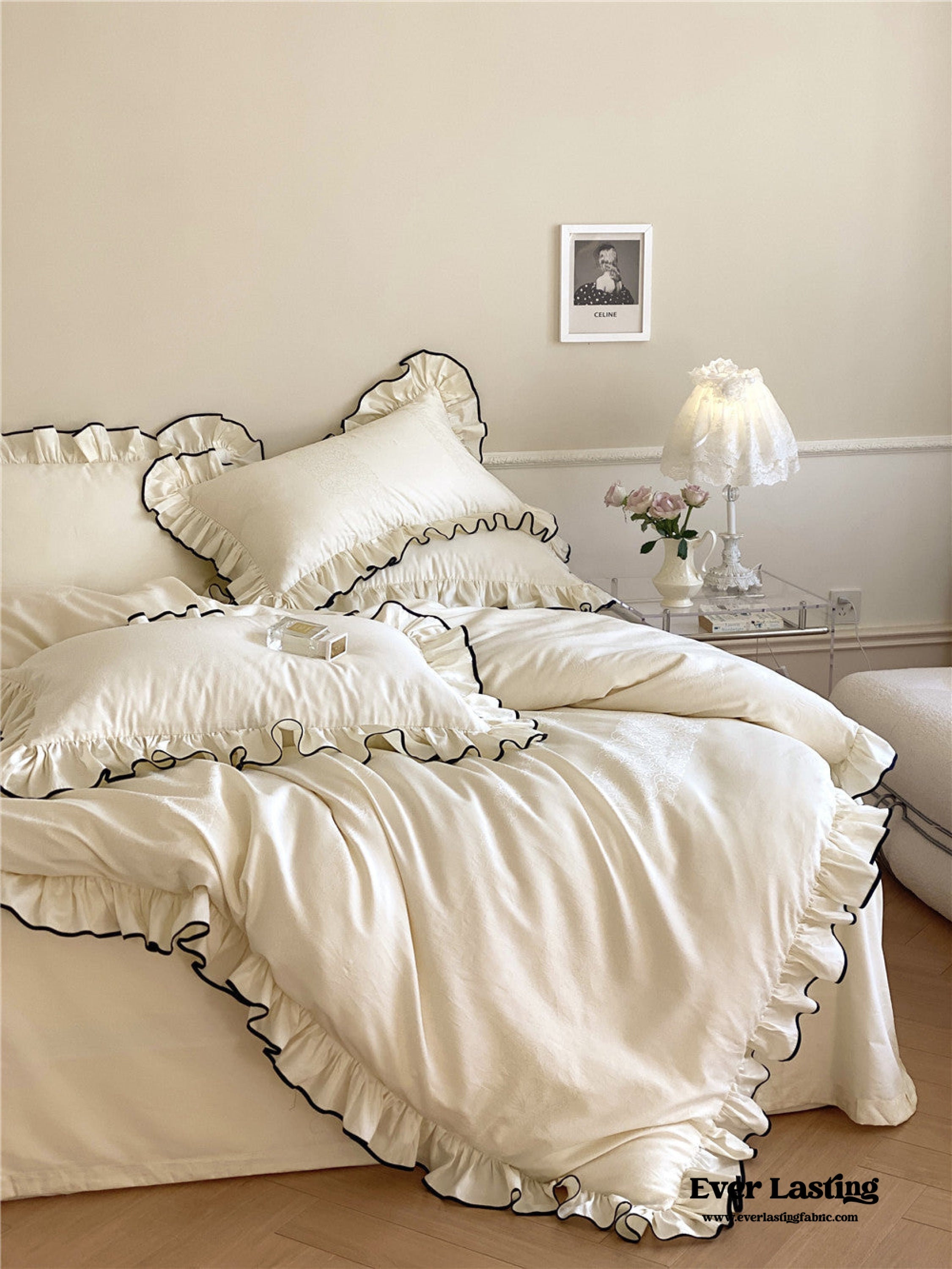 Indulge in the captivating soft coquette aesthetic of Magchic's Silky Ruffle Bedding Set. designed to enhance your bedroom with elegance. The fabric is meticulously crafted with an incredibly soft and smooth texture. accentuated by its flowing jacquard weave. Made from exquisite 100S Australian cotton. offers a gentle caress against your skin. ensuring both comfort and durability. The refined wide black stripe and delicate ruffled hem add a touch of sophistication to your decor. creating a space of opulence and style. Each duvet cover features four corner ties and a hidden zipper to keep your duvet insert securely in place. Create a stylish haven with this unique. comfortable ensemble.