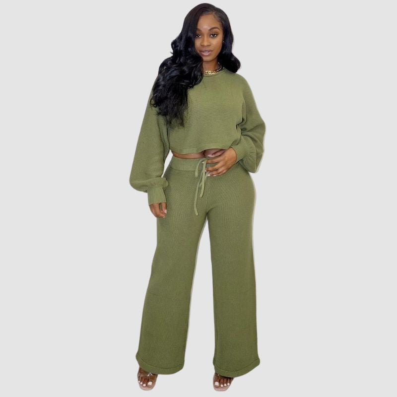 Características: Conjunto. Pantalones. Top corto. Suéter. Tejido. Manga larga. Pantalones largos. Cuello redondo. Suelto. Cintura con cordón. Pierna ancha. Color sólido. Cálido .