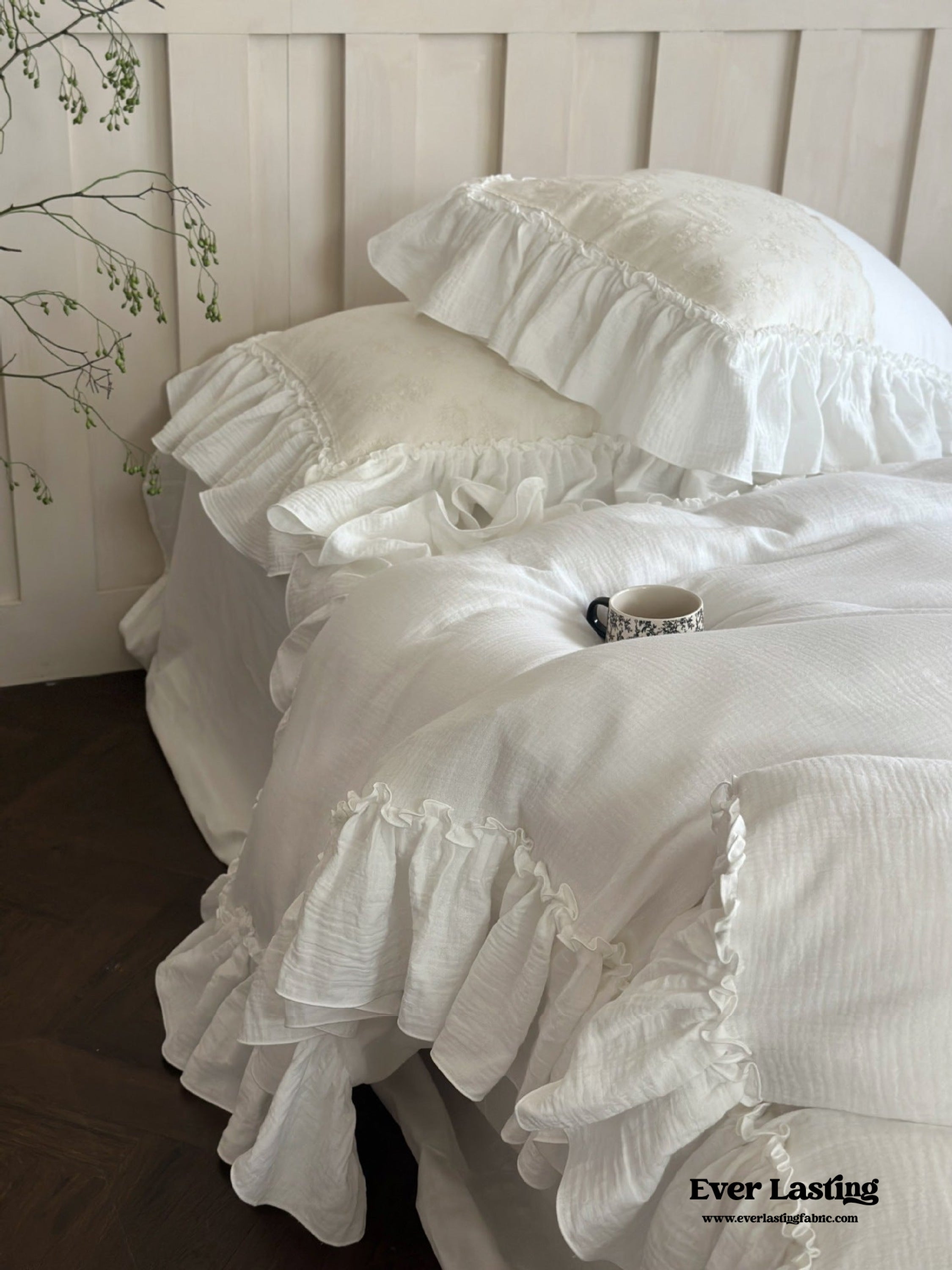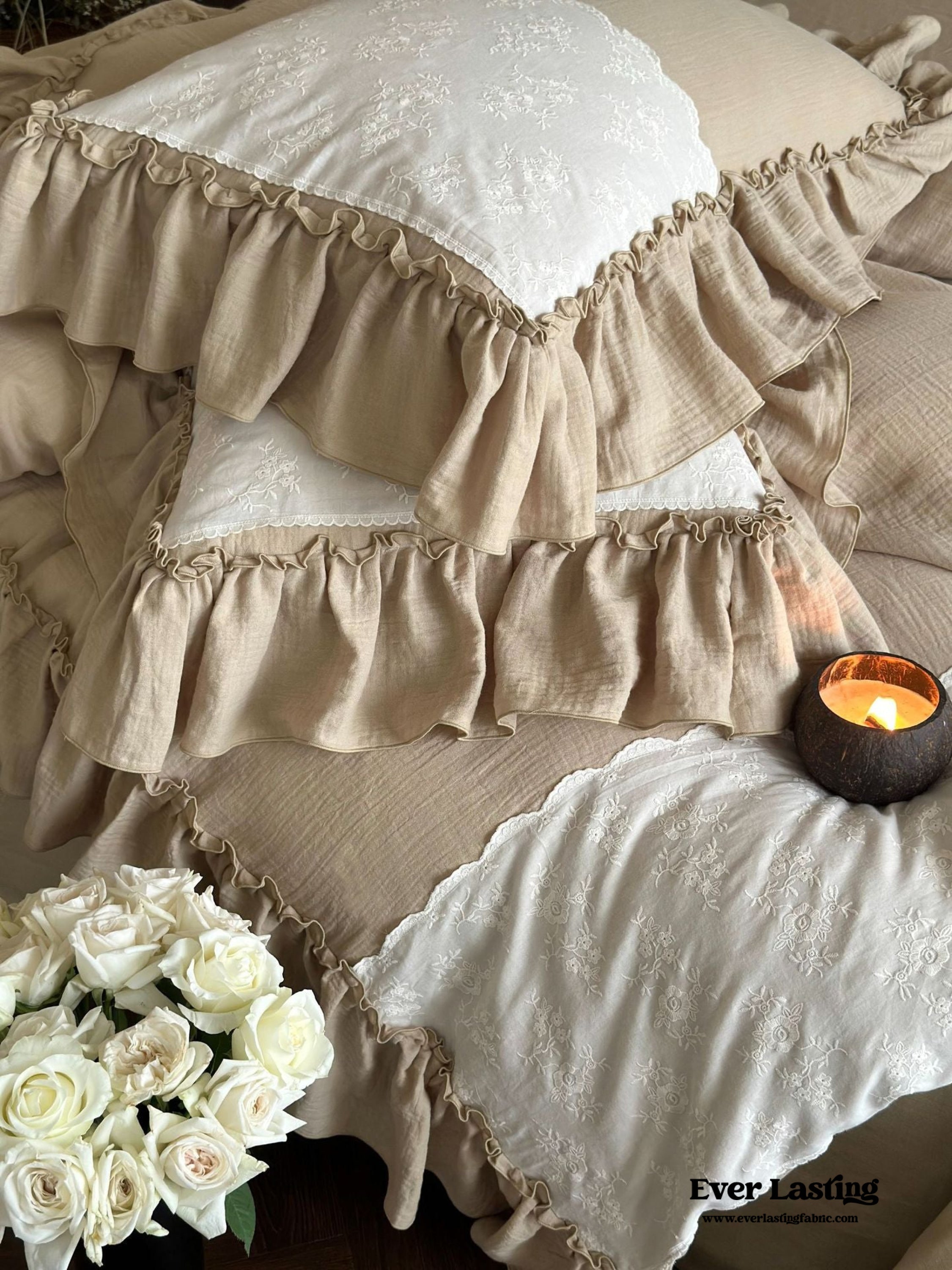 Experience a tranquil and refined atmosphere with the Celeste Soft Lace Embroidered Ruffle Bedding Set from Magchic. This indulgent set is made from double gauze cotton for a luxuriously soft and breathable feel. featuring intricate lace embroidery for added elegance. Delicate ruffles and fine details create a charming cottagecore aesthetic. The practical duvet cover includes corner ties and a concealed zipper. ensuring durability and effortless upkeep while providing a secure fit for your duvet insert. Enjoy a luxurious slumber with this enchanting bedding set that seamlessly combines comfort. beauty. and functionality for a serene atmosphere.