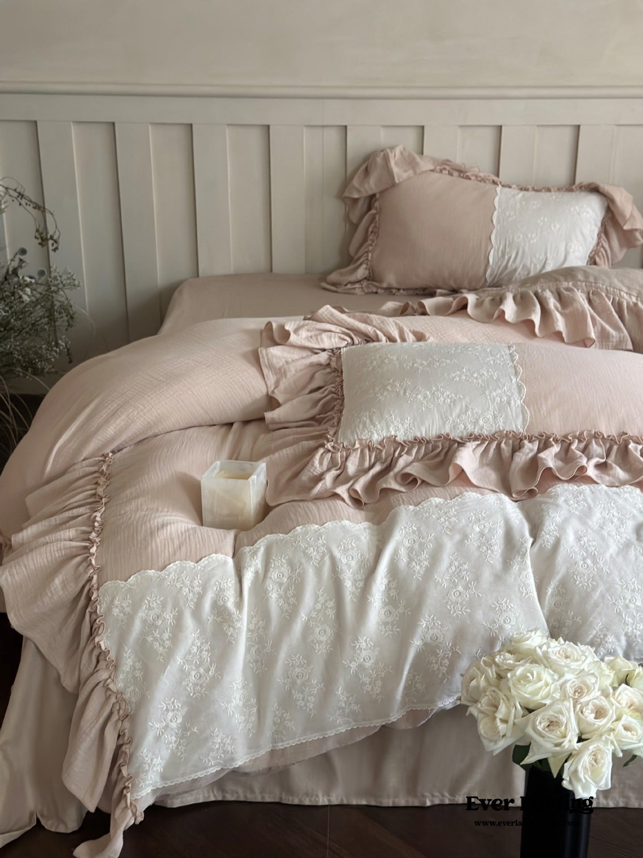 Transform your bedroom into a tranquil oasis with Celeste Soft Lace Embroidered Ruffle Bedding Setby Magchic. Crafted with double gauze cotton. this opulent set provides superior softness and breathability. while delicate lace embroidery adds a touch of elegance. Delicate ruffles and intricate details exude a romantic. cottagecore charm. Each duvet cover is equipped with corner ties and a concealed zipper for secure placement of your duvet insert. ensuring long-lasting durability and effortless upkeep. Indulge in a luxurious night's sleep with this enchanting bedding set. where comfort. beauty. and practicality unite to create a serene and sophisticated atmosphere.