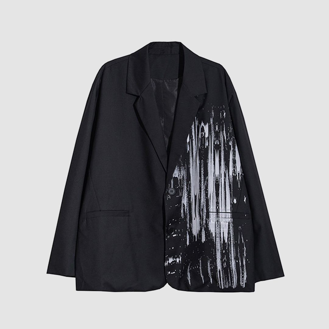Traje negro puro y sencillo con grafiti de tinta blanca. Deja que todo el conjunto se despida de la monotonía. Simple y menos monótono. Ideal para ocasiones formales e informales.