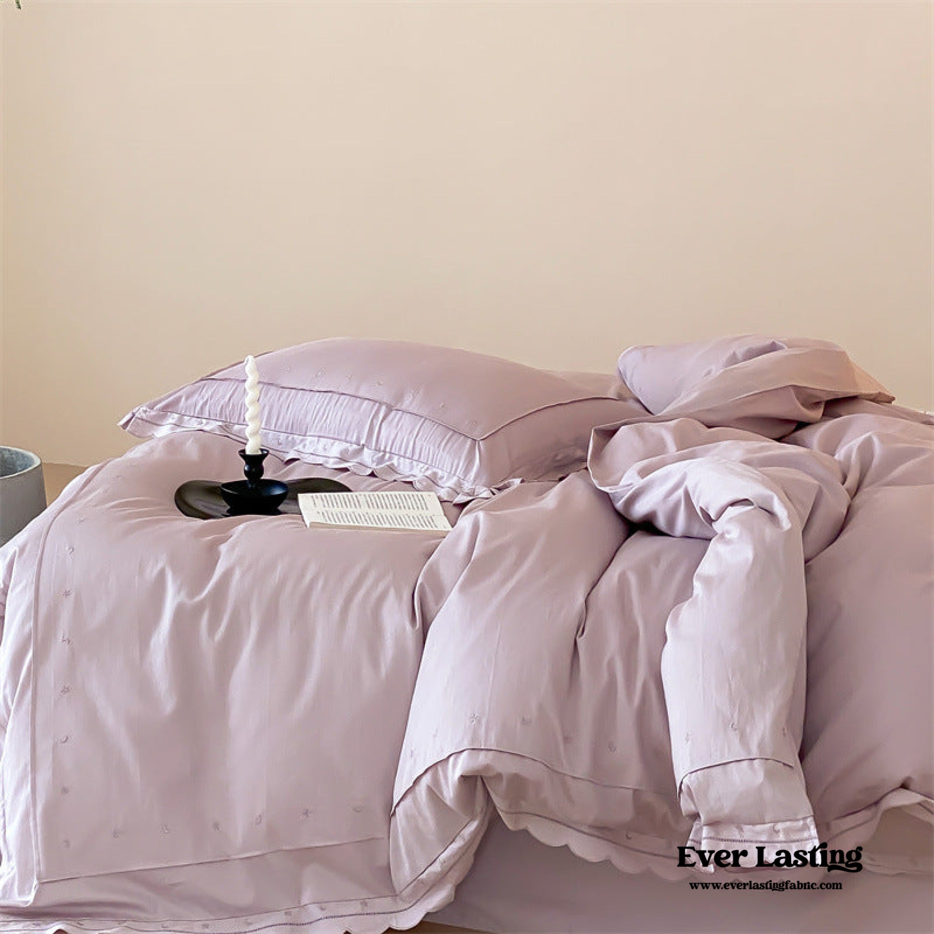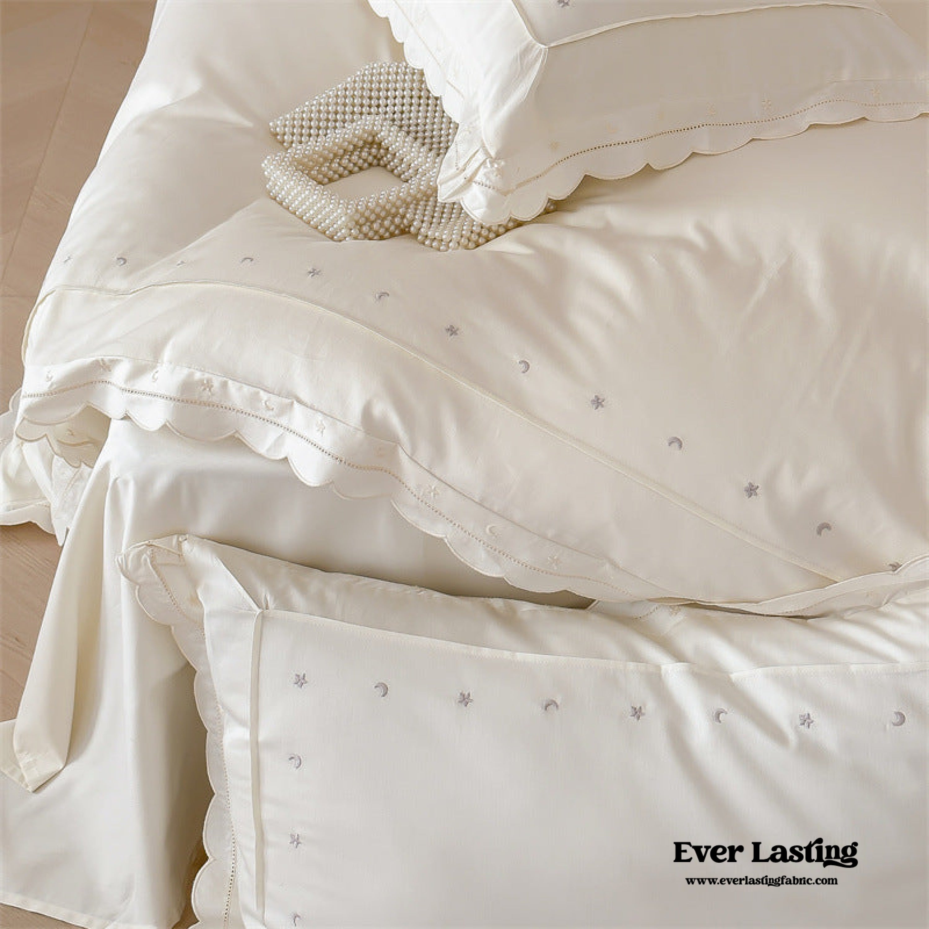 Transform your bedroom into a celestial sanctuary with our Star Gaze Short Cake Ruffle Bedding Set. Crafted with celestial inspiration. this bedding set invites you to dream under the stars in a cloud of softness. The short cake ruffles add a whimsical touch. creating a magical escape within your own space. Immerse yourself in the allure of the night sky and indulge in the sweet embrace of this luxurious bedding set. Each duvet cover is equipped with four corner ties and a hidden zipper to ensure your duvet insert stays securely in place all night. Elevate your sleep experience with celestial elegance. and let the Star Gaze Short Cake Ruffle Bedding Set become the focal point of your dreamy retreat.