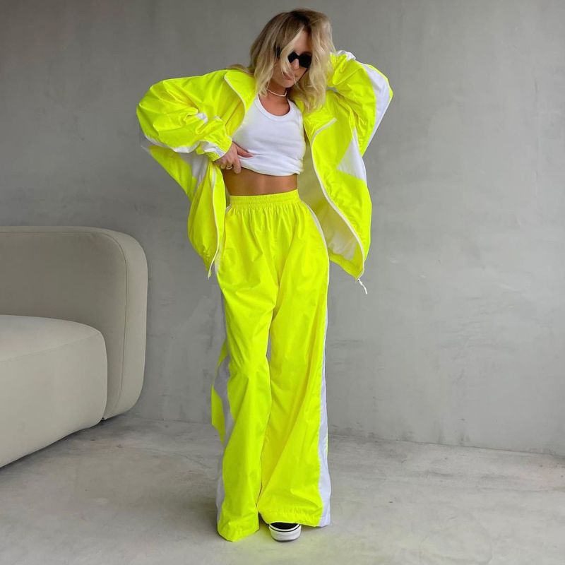 Características: Conjunto. Pantalón. Chaqueta. Manga larga. Contraste de color. Pantalón largo. Cintura con cordón. Cintura alta. Pierna ancha. Suelto.