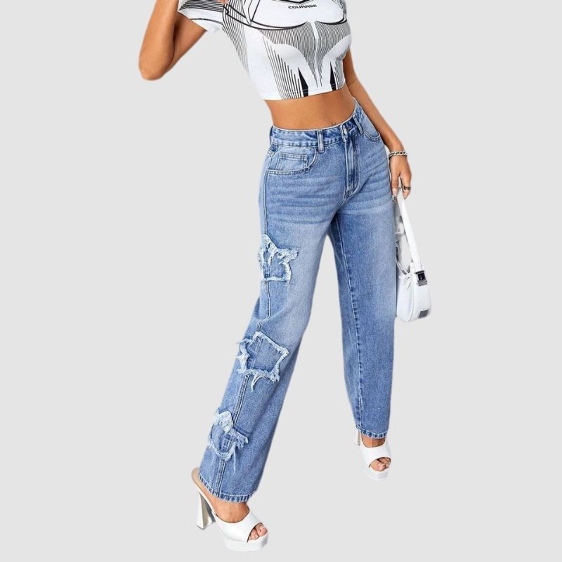 Características: Pantalones. jeans. diseño de parche de estrella con borlas. cintura alta. vintage. lavado. no elástico. cremallera frontal. color sólido. pierna recta . ajuste relajado . unisex. conjuntos de pareja.