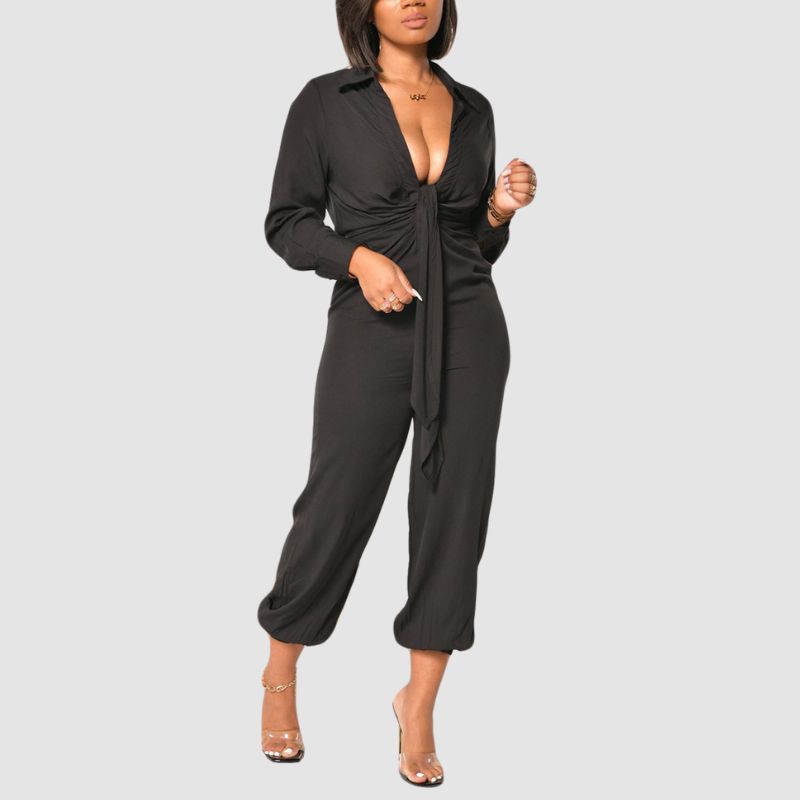 Características: Mono. Pantalones. Corte relajado. Lazado. Cintura alta. Pierna ancha. Cuello en V. Solapa. Pliegues. Mangas largas.
