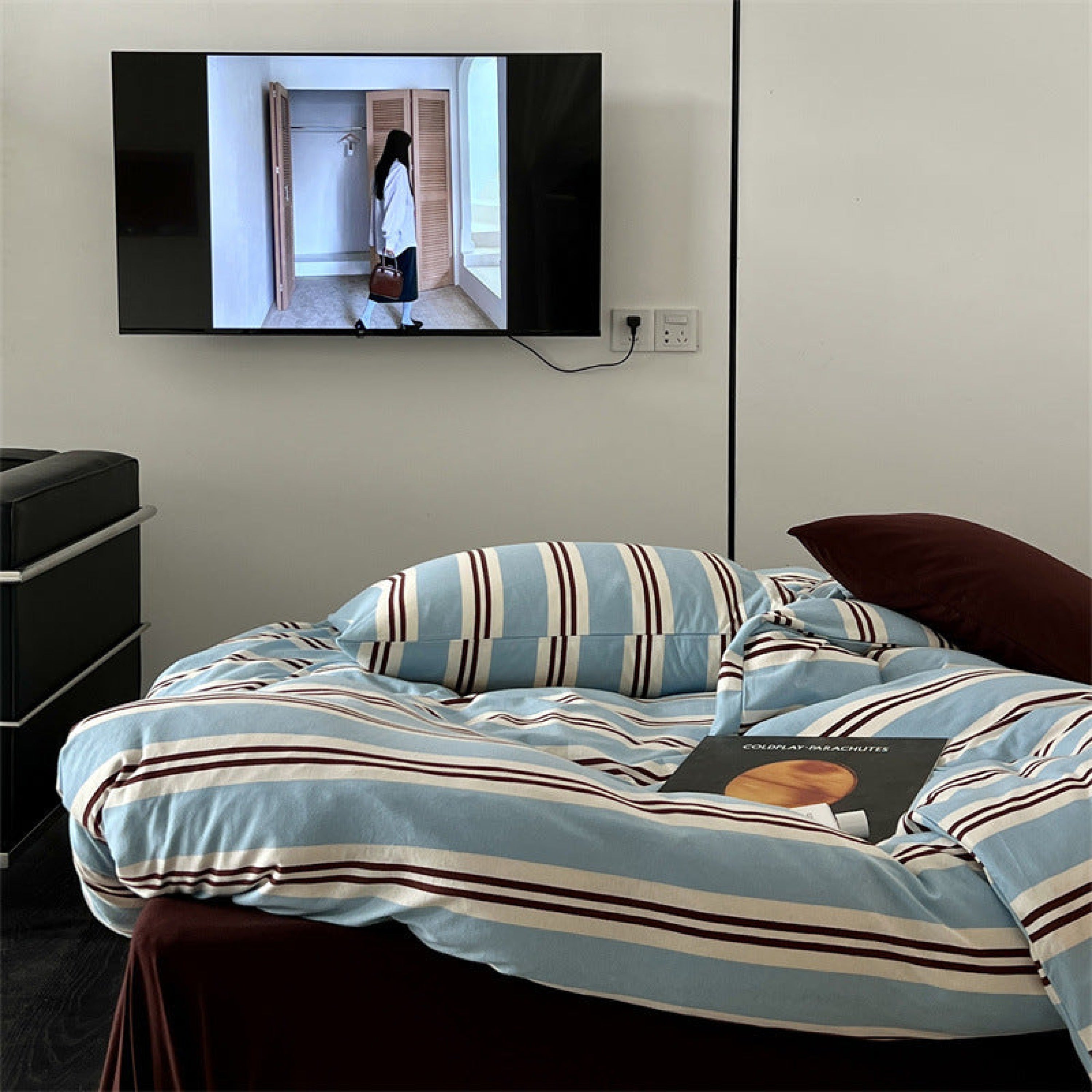 Transform your bedroom into a haven of cozy nostalgia with our Jersey Knit Retro Stripe Bedding Bundle. Crafted for both comfort and style. the soft jersey knit fabric embraces you in a gentle. inviting embrace. The retro stripes add a touch of timeless charm. reminiscent of classic designs that evoke fond memories. Indulge in the luxury of a restful night's sleep wrapped in the warmth of retro-inspired elegance. Each duvet cover is equipped with four corner ties and a hidden zipper to ensure your duvet insert stays securely in place all night. Elevate your bedding experience with our Jersey Knit Retro Stripe Bedding Bundle. where comfort meets a stylish journey back in time.