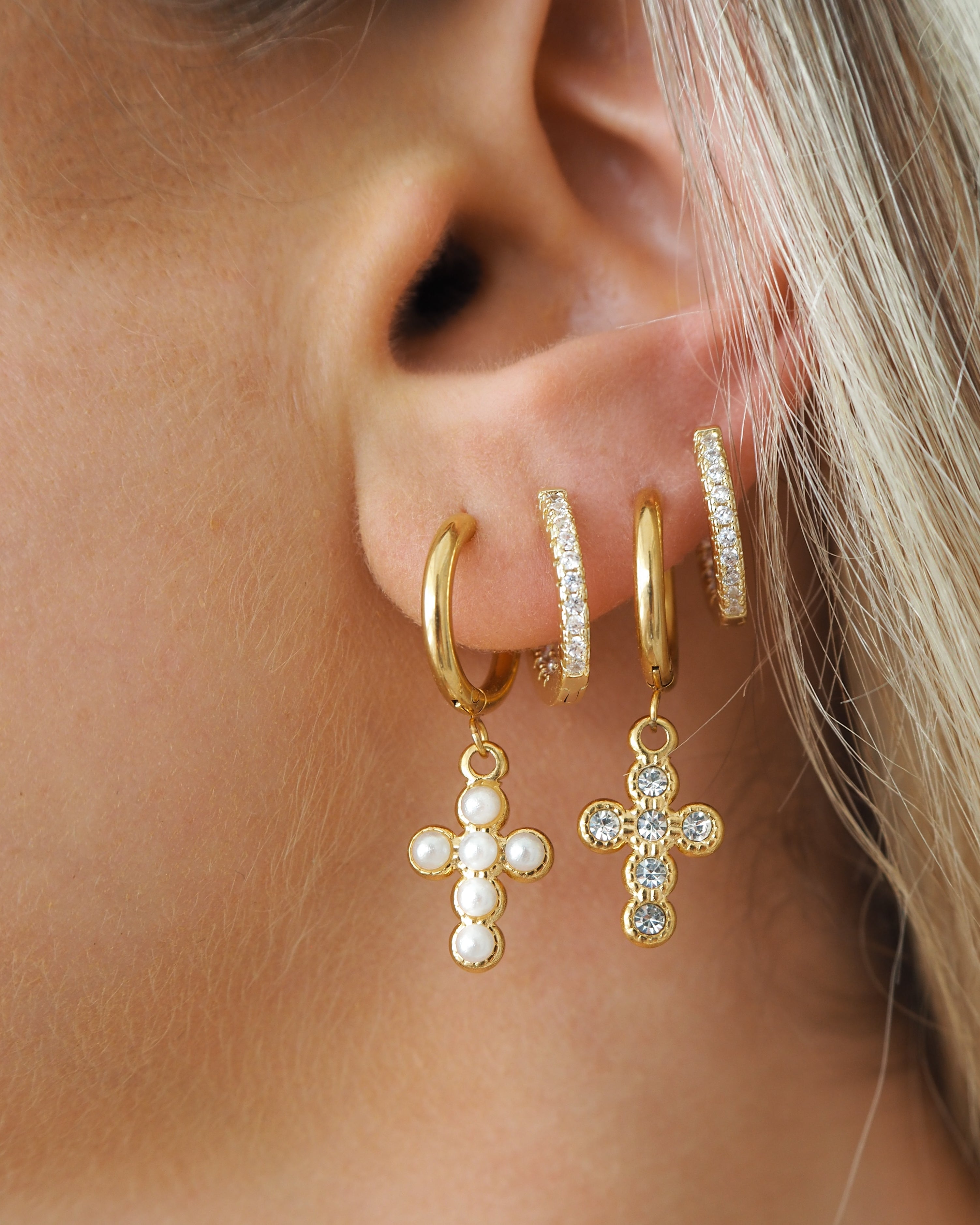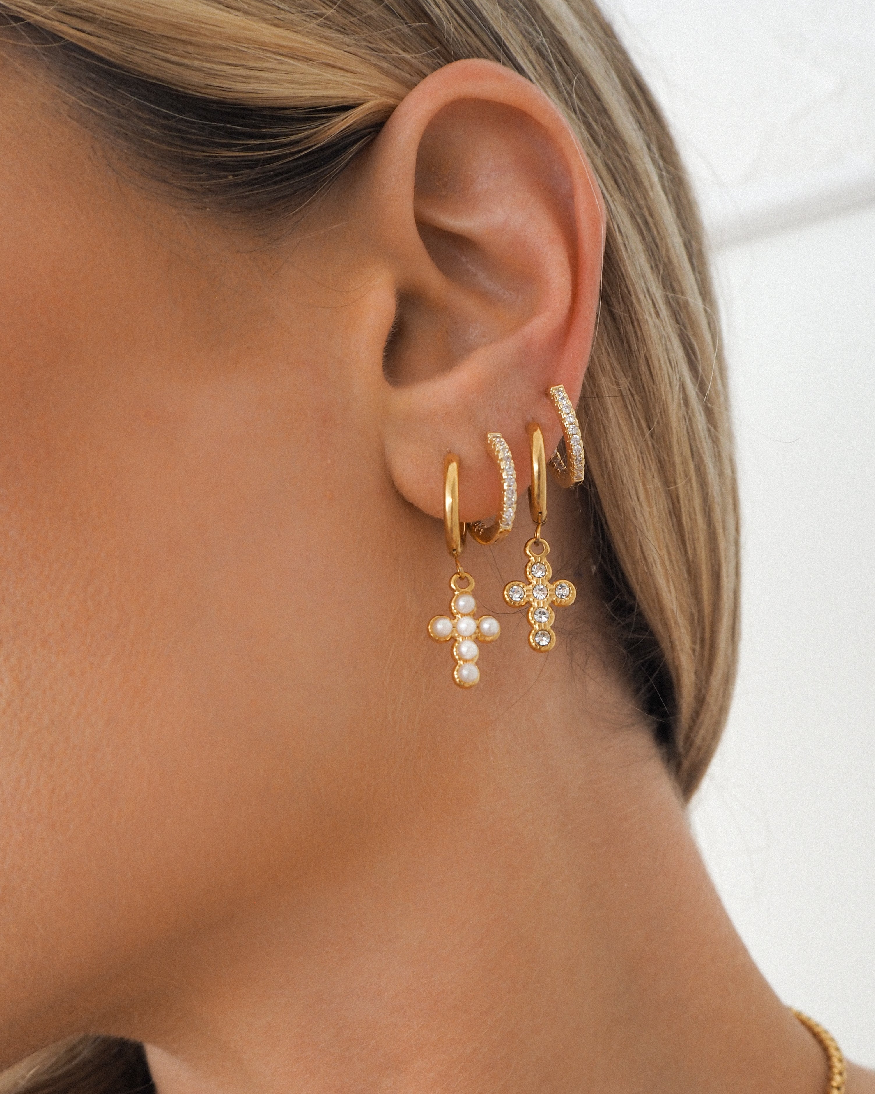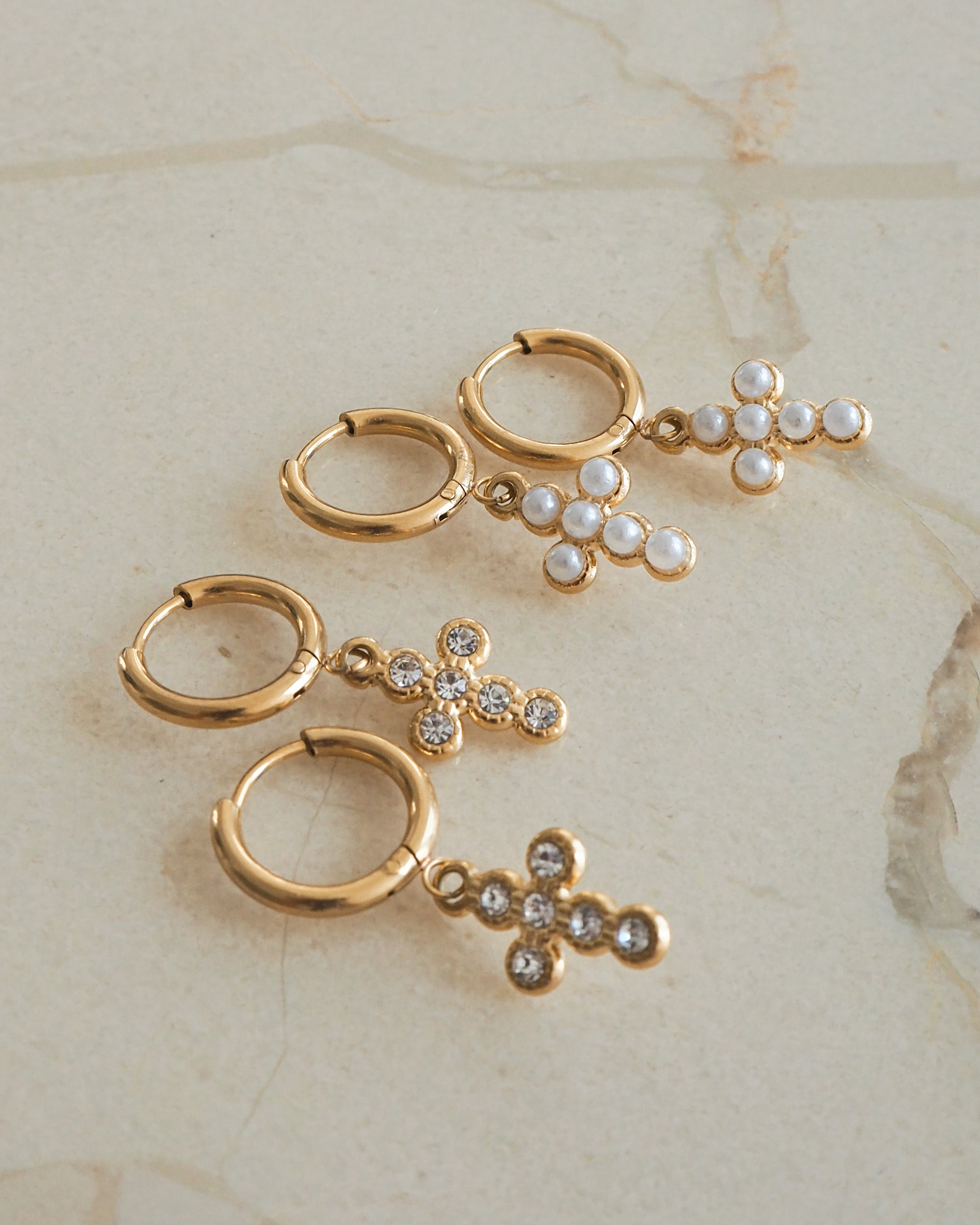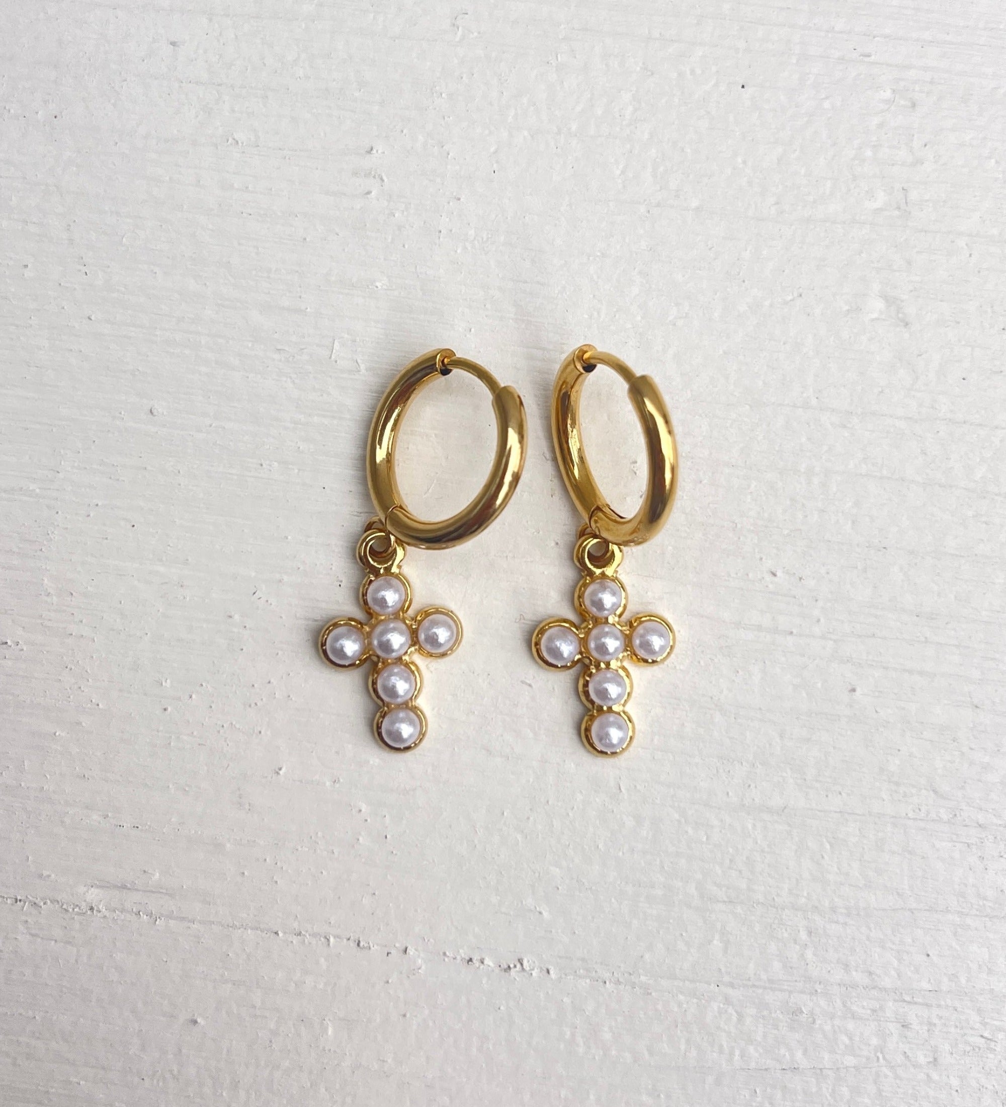 Gold andPearl Cross Huggie Hoops