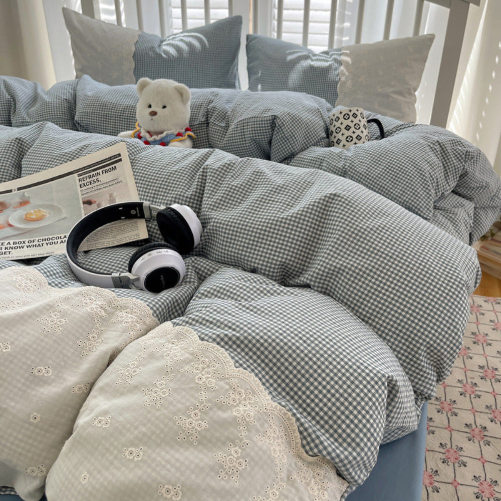 Embrace vintage-inspired charm with the Sophia Gingham Lace Washed Cotton Bedding Set by Magchic. This beautifully crafted set features a soft washed cotton fabric that's gentle on the skin and perfect for year-round comfort. The classic gingham design is complemented by delicate lace trim. adding a romantic. cottage-style touch to your bedroom decor. Designed with functionality in mind. the duvet cover includes corner ties and a hidden zipper to keep your insert secure and in place.