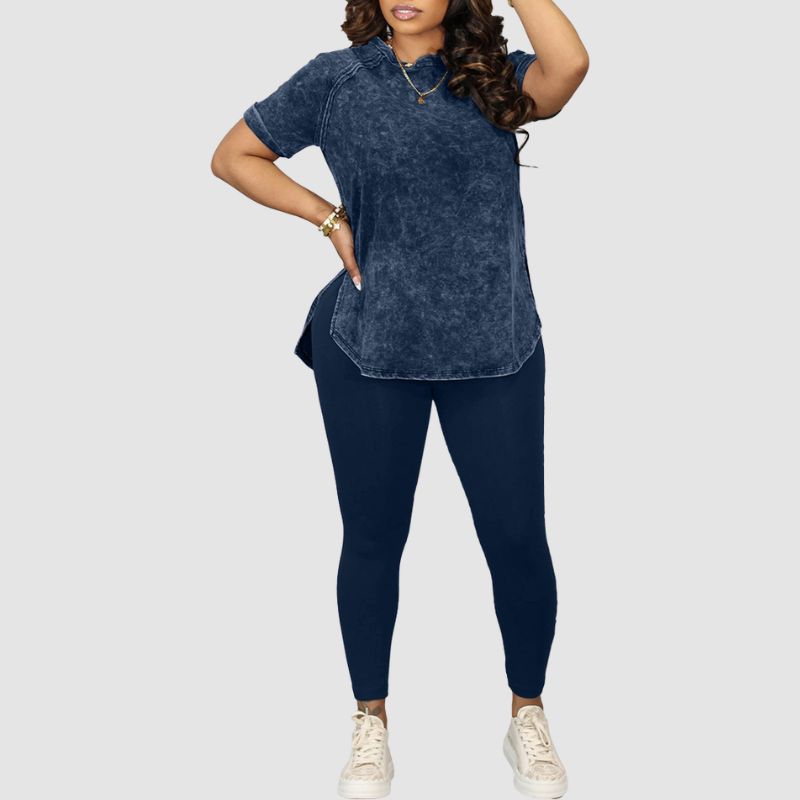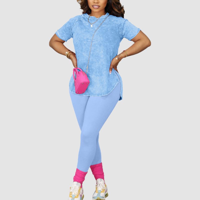 Features: Set. pants. short sleeve. long pants. side pocket. high waist. bodycon. solid color.