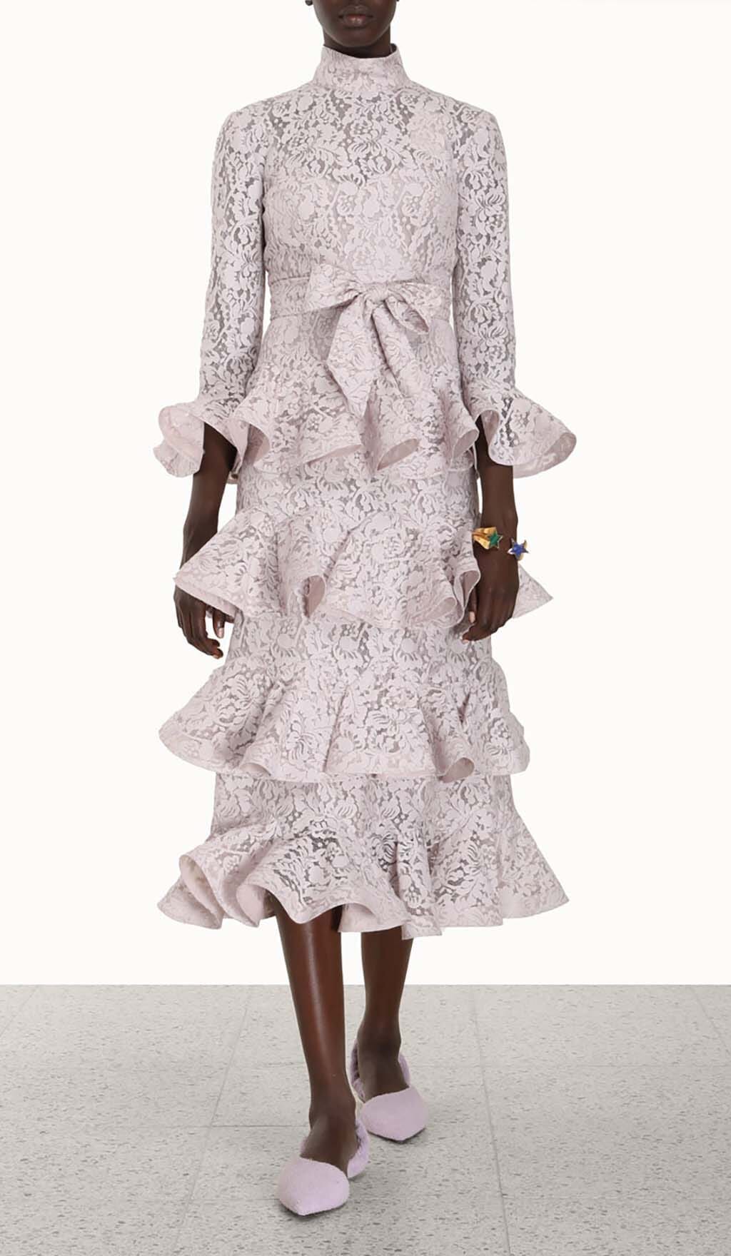 This dress is perfect for a summer party or special event! The tiers of floral lace give it a romantic feel. while the midi length makes it perfect for showing off your favorite shoes.